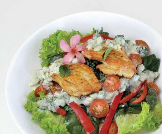 Para el aderezo griego Tzatziki, se pica finamente las hojas de menta y hierbabuena, el ajo y el pepino sin cascara ni semillas también finamente picados y se agrega todo en un recipiente junto con el Yogurt, el sumo de limón amarillo, el aceite de olivo y se condimenta al gusto con sal y pimienta verde. se reserva en el refrigerador. se sazona con sal y pimienta la pechuga y se cocina en un sartén, se cortan las verduras en trozos de bocado y se mezclan en un bowl y se adereza con el tzatziki y se sirve el pollo cortado en fajitas y pistaches. Disfrutar.