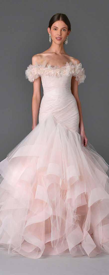La naturaleza es una fuente de inspiración para la diseñadora Monique Lhuillier, en su colección ella describe a sus novias como hermosas “ninfas” rodeadas de flores. Sus diseños se distinguen por su “soltura” y en esta ocasión deja a un lado la excesiva pedrería, con lo que da un toque ligero y sexy a sus diseños.