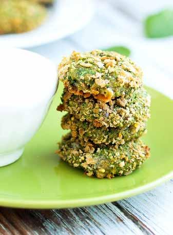 Para hacer 15 nuggets (aprox.) tritura media taza de almendras y dos puñados de espinacas, añade dos huevos batidos, una taza de pan rallado, media taza de harina de linaza, una cucharadita de albahaca y otra de orégano, y media taza de queso rallado. Después, mézclalo todo bien, haz pequeñas bolitas con la masa, aplástalas, rebózalas con pan rallado y hornéalas.