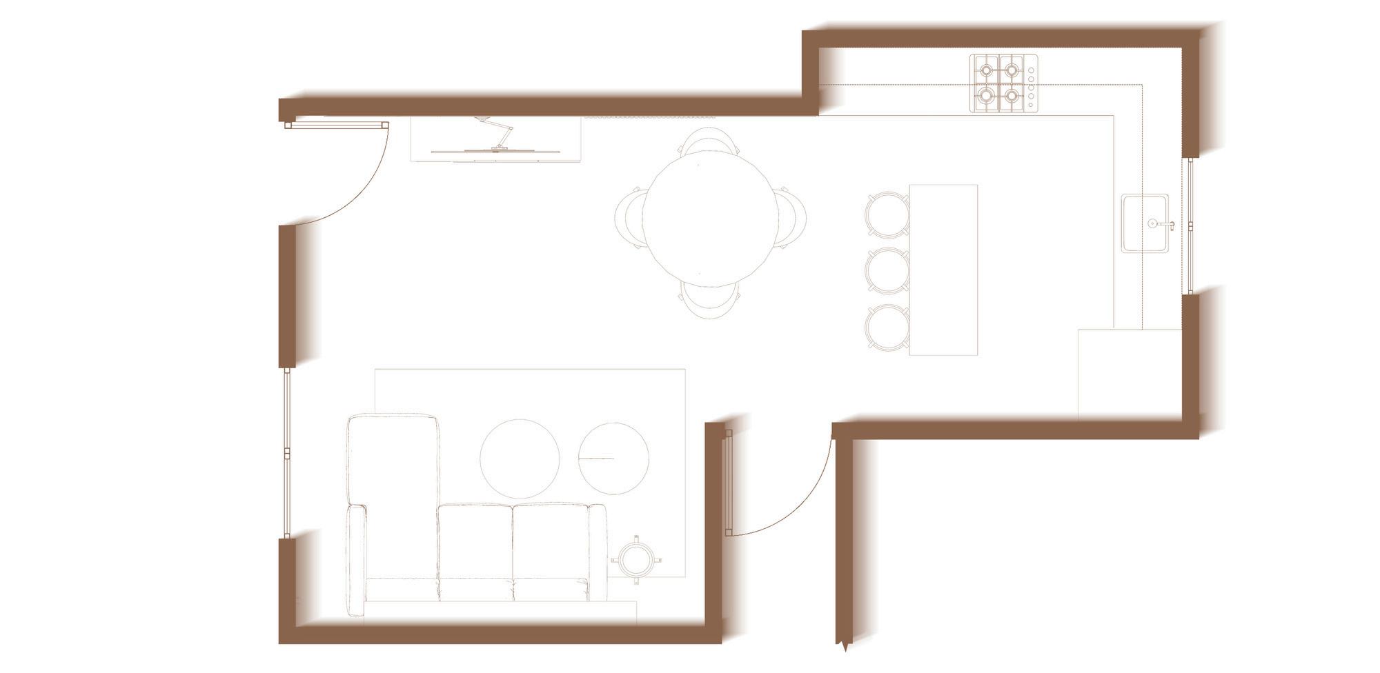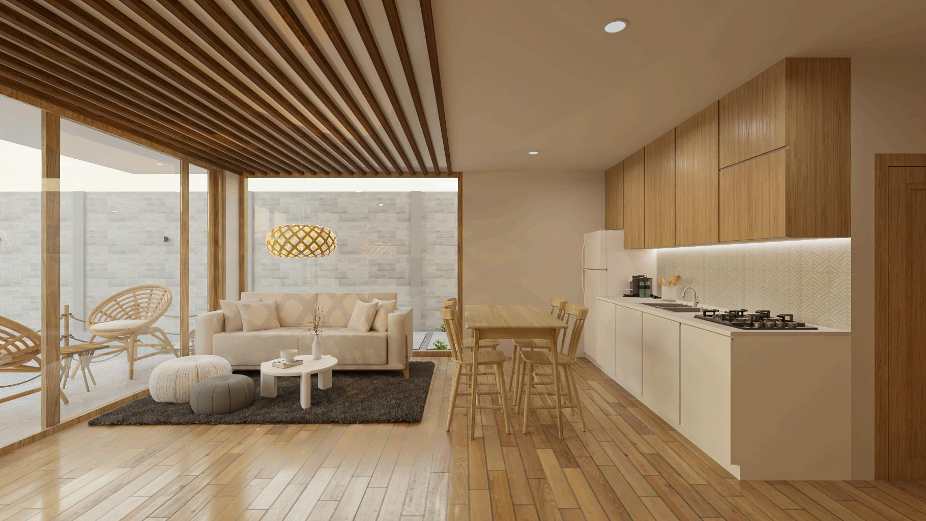 El terreno cuenta con un área de 56 m² ,tiene una distribución definida que esta conformada por cocina, comedor y sala. Se a diseñado el entorno incorporando elementos decorativos y mobiliario funcional, siguiendo el estilo solicitado por el cliente. Asimismo, se ha incorporado un minibar con un área de descanso, con el objetivo de brindar mayor confort y armonía al espacio