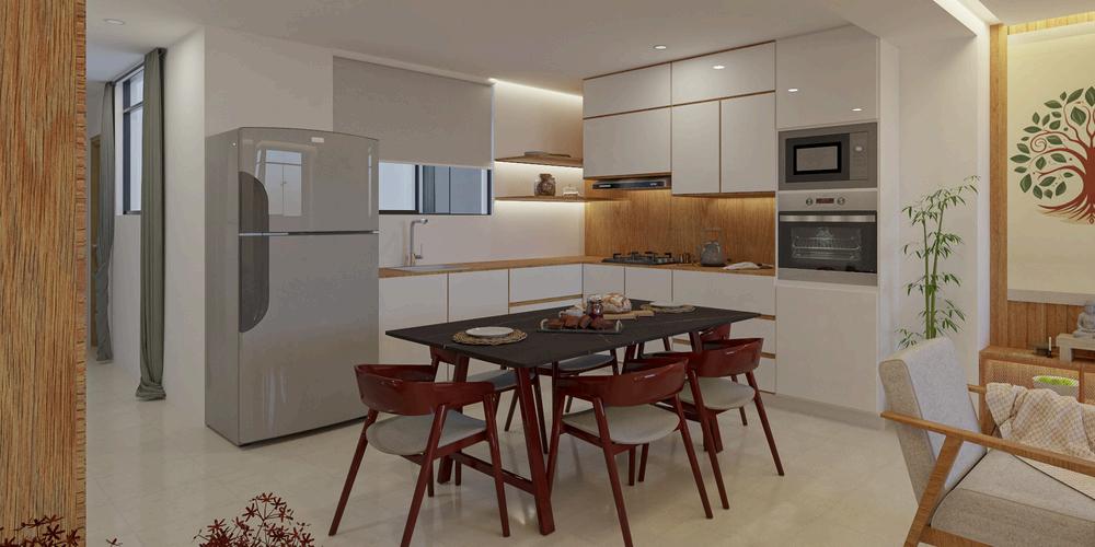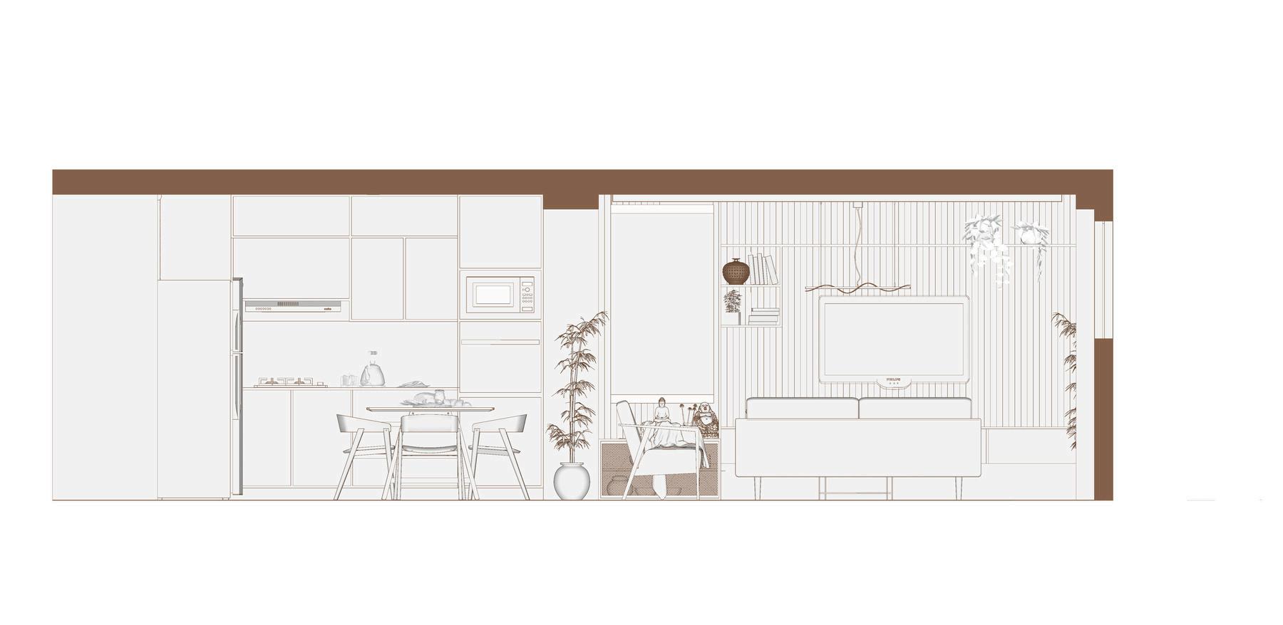 En el corte longitudinal se aprecia el diseño de la cocina, equipada con muebles de melamina destinados al almacenamiento, junto con el juego de comedor. Se destaca también un mueble de TV personalizado, complementado con estantes suspendidos sobre un wall panel, y un espacio especialmente destinado a un altar para Buda, en atención a los requerimientos del cliente