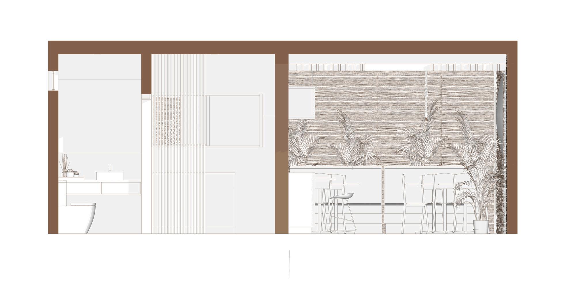 En el corte transversal se puede observar parte del bar, el cual cuenta con estantes altos, así como una sección del salón comercial. En esta vista se aprecian también algunos complementos decorativos, como paneles de bambú y mobiliario acompañado de plantas. Finalmente, se muestra una parte del baño, diseñado para ser funcional y acorde con el estilo del establecimiento