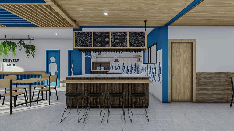 El terreno cuenta con un área de 140 m² y se trata de un espacio comercial que requería una ambientación acorde con la paleta de colores del logo para lograr una mejor integración con el entorno. Por ello, se utilizaron elementos decorativos y mobiliario adaptados a dicha paleta, incorporando una temática marina que refuerza la identidad del negocio