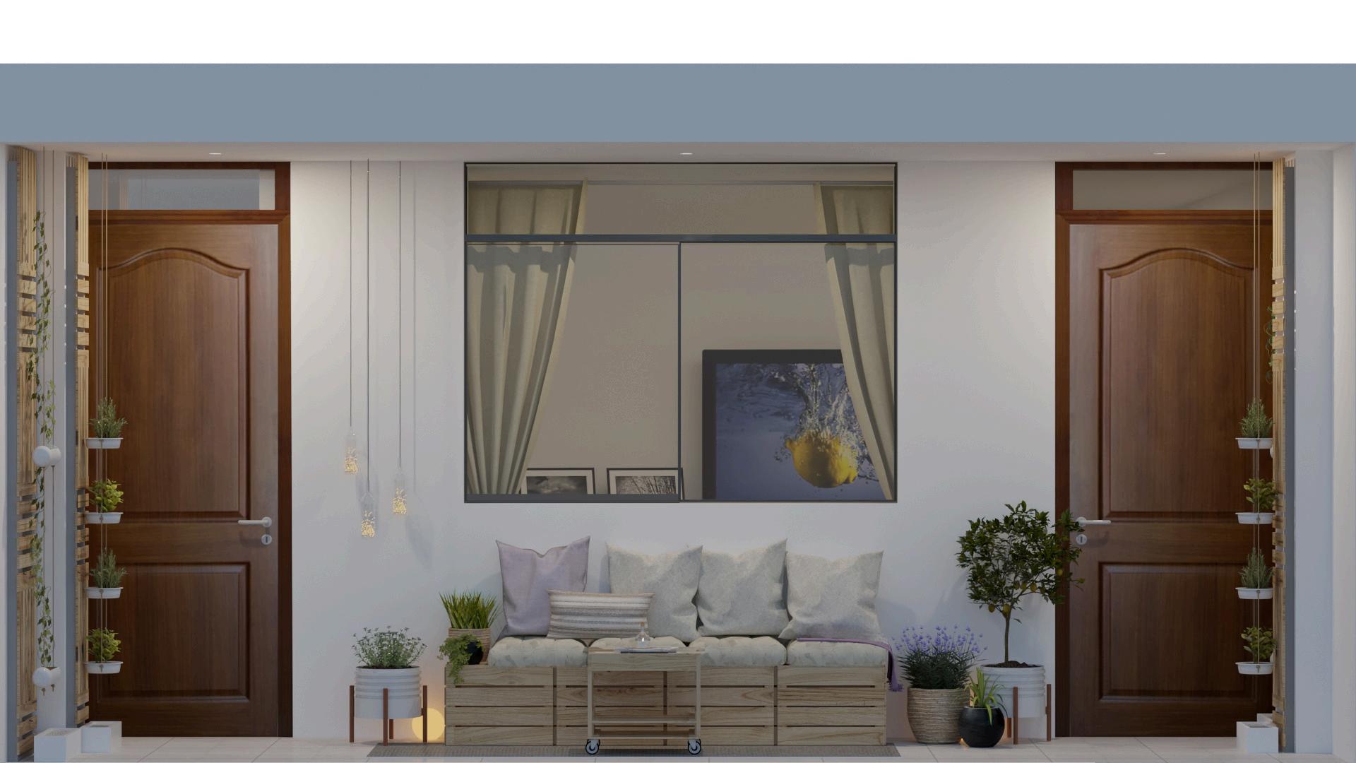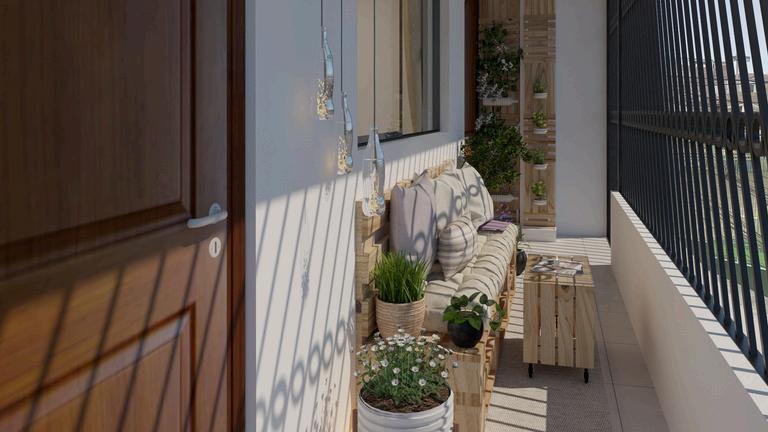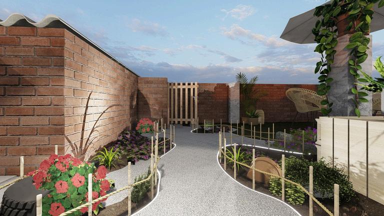 El terreno cuenta con un área de 8 m² y se ha diseñado un ambiente de relajación para el usuario, utilizando elementos sostenibles y de bajo presupuesto. El espacio está rodeado de vegetación e incorpora jardines verticales para optimizar el área disponible. Se han elegido plantas de bajo mantenimiento y que requieren luz solar indirecta, creando así un entorno armonioso y funcional