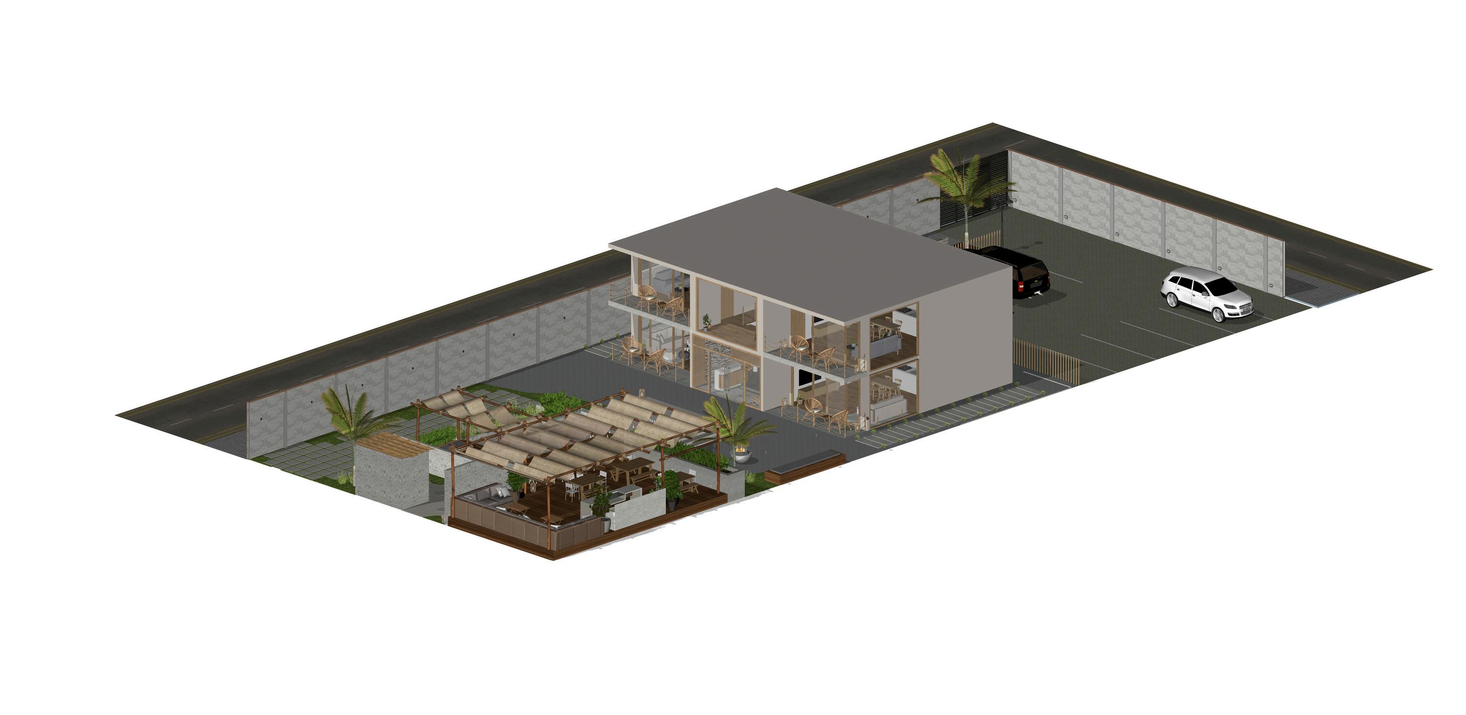 El terreno cuenta con un área de 38 m² y presenta una distribución definida que incluye cocina, comedor y sala. El estilo ha sido modificado según los requerimientos del cliente, optando por un enfoque más minimalista y rodeado de vegetación. Se ha incorporado el color favorito del usuario en el entorno, generando contraste con mobiliarios adicionales de diseño funcional que complementan y optimizan cada espacio