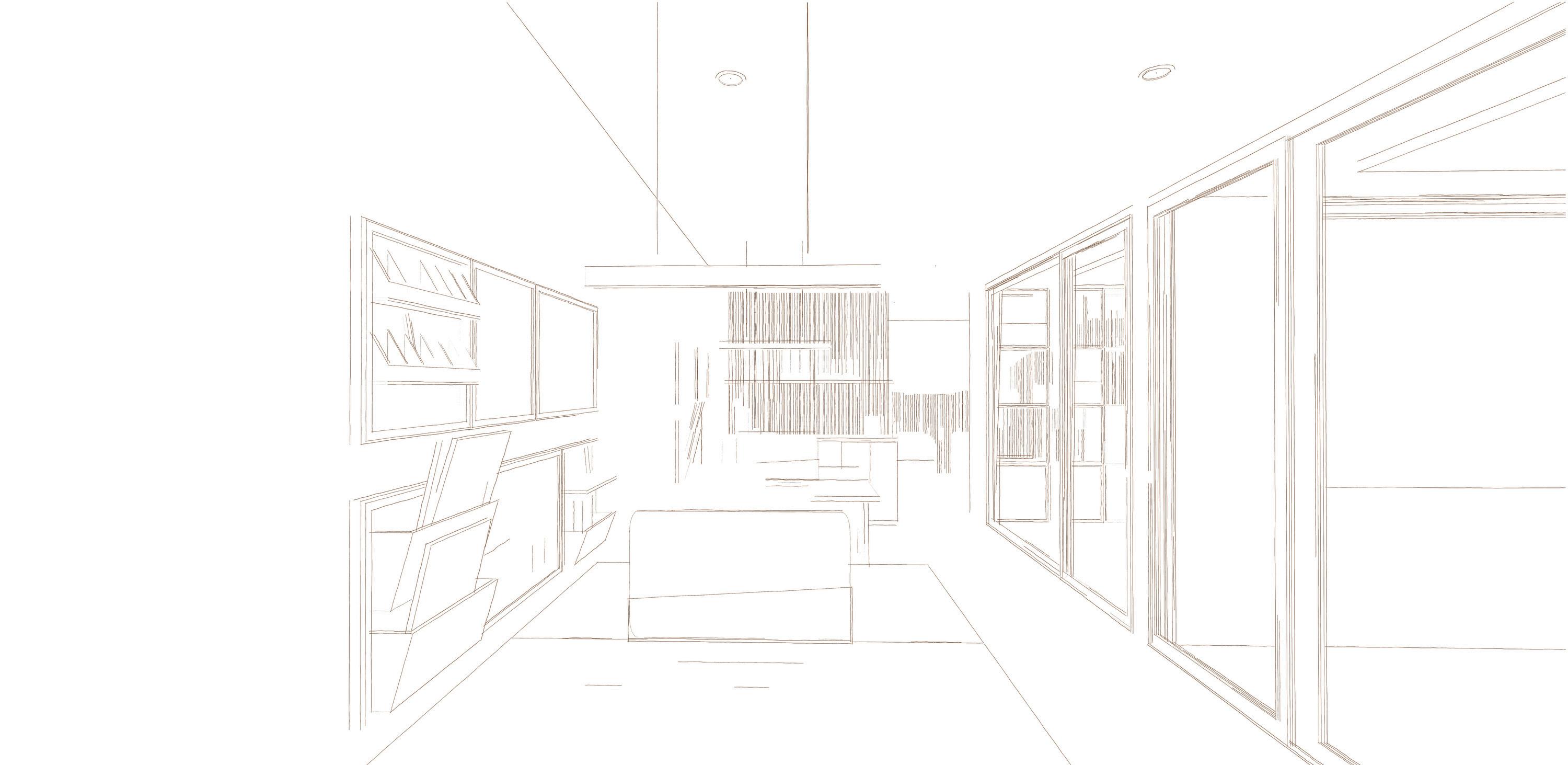 En el corte transversal se puede apreciar la sala del espacio diseñado, conformada por un sillón de un solo cuerpo y una butaca individual. Además, se incluye un minibar y un área de descanso para el cliente, tal como fue solicitado en los requerimientos del proyecto