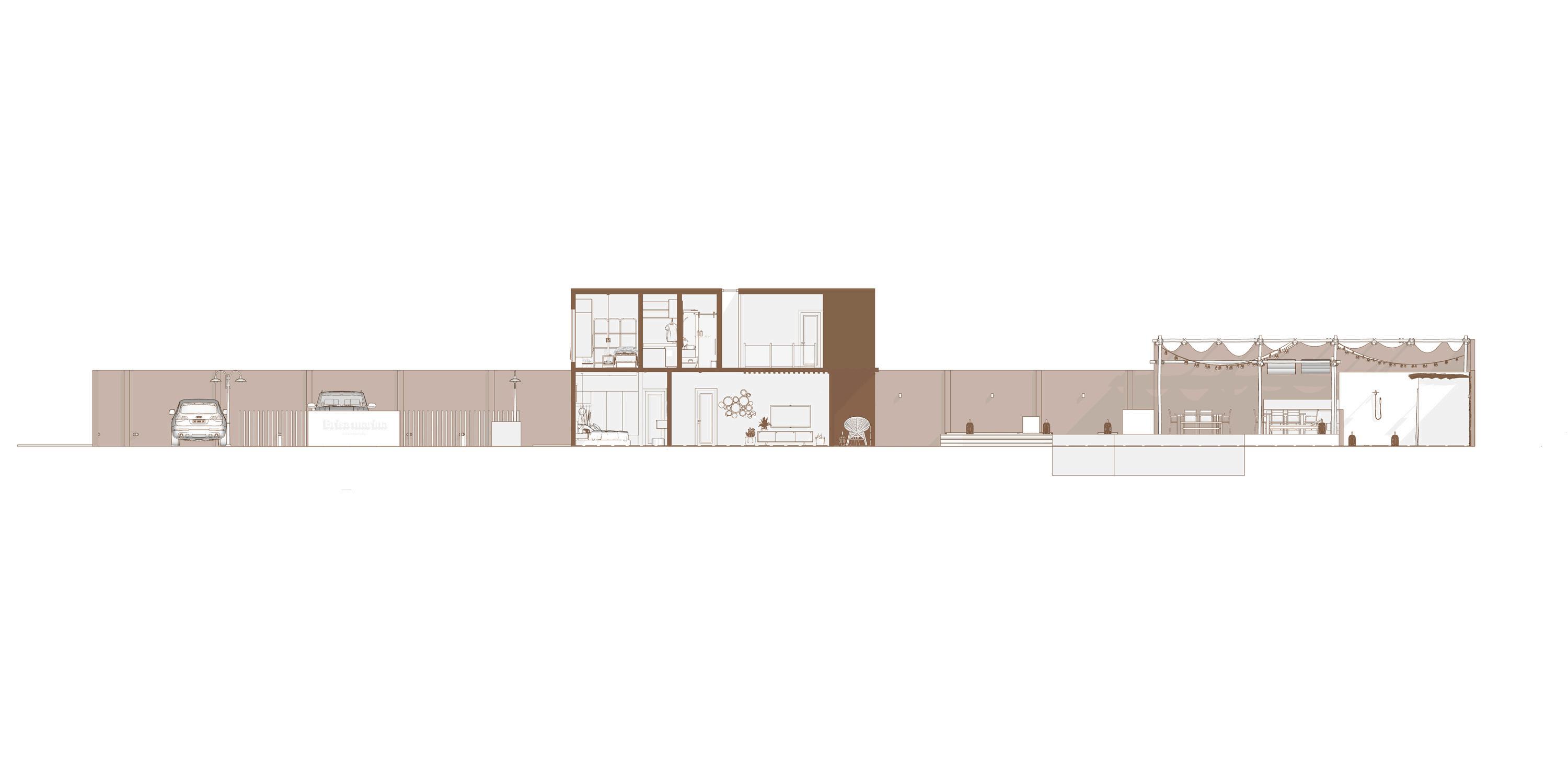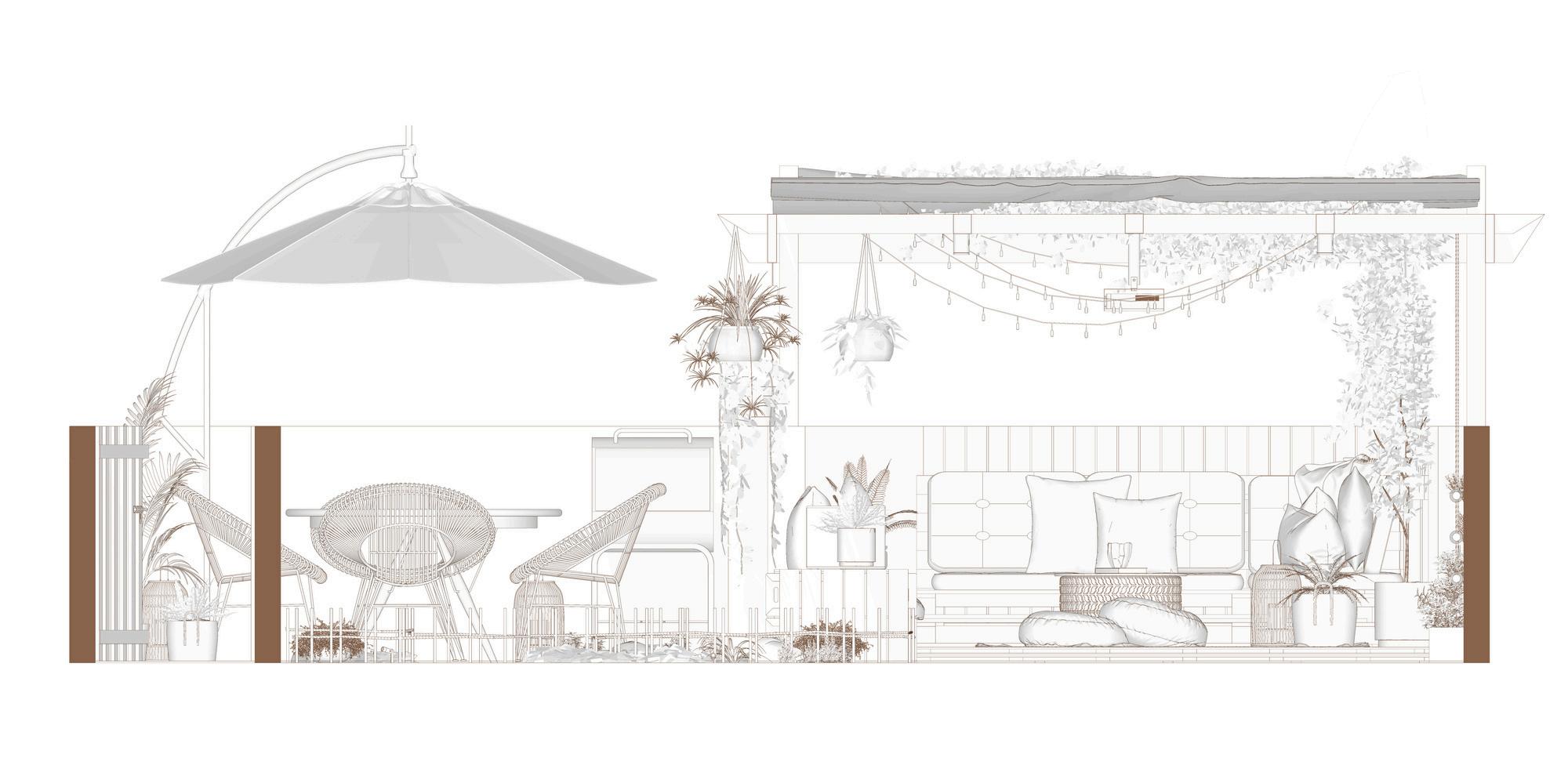 En el corte transversal se aprecia el área de relajo, conformada por dos zonas diferenciadas: una dedicada a la parrilla y otra a la sala estar. Ambas están protegidas del sol mediante una sombrilla y una pérgola, respectivamente, y se encuentran adecuadamente equipadas con mobiliario sostenible elaborado en madera reciclada. La vegetación es abundante y está integrada como parte esencial del diseño, en respuesta a los requerimientos del cliente