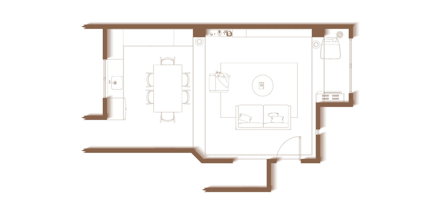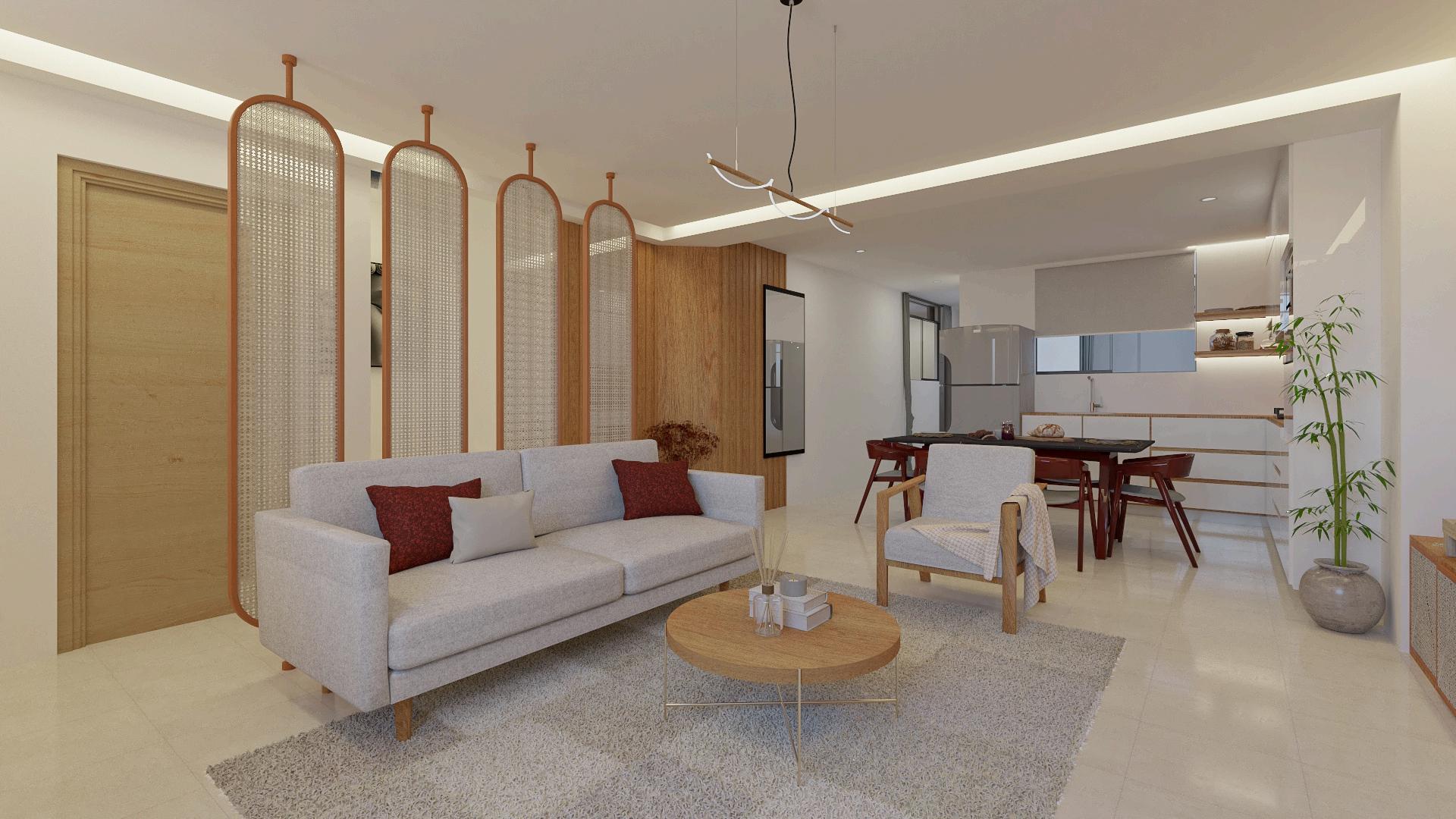 En el corte longitudinal se aprecia una mayor amplitud del espacio, destacando la sala en forma de L, diseñada para una mejor adaptación al entorno y una mayor sensación de apertura dentro del departamento. Este ambiente se complementa con estantes suspendidos y elementos decorativos que aportan funcionalidad y estilo al conjunto