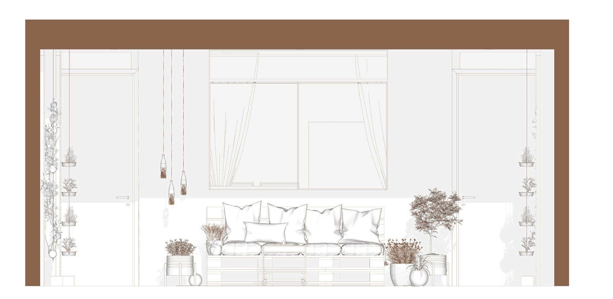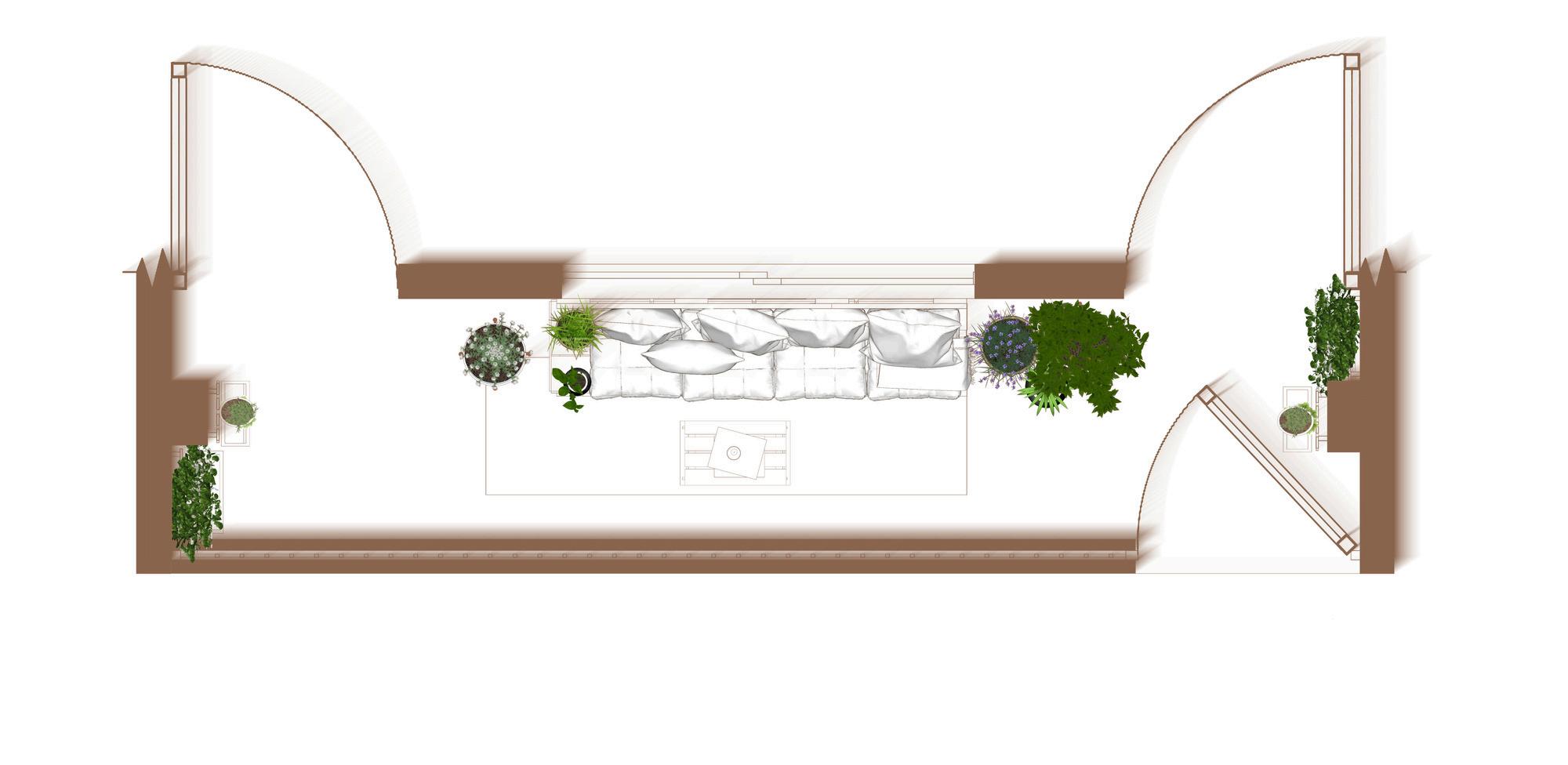 En el corte longitudinal se aprecia con mayor claridad la distribución del espacio: el sillón y la mesa con ruedas, ambos fabricados con madera reciclada; la luminaria colgante; la vegetación que rodea el ambiente y los jardines verticales ubicados en las esquinas. De esta manera, se logra un aprovechamiento eficiente de todo el espacio disponible