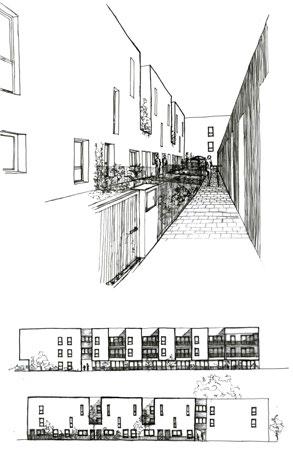 Les fragmentations verticales permettent de développer un linéaire de projet qui évite la lecture d’une « barre », en s’approchant de l’échelle individuelle. Le jeu des retraits permis par les loggias va dans ce sens. On semble lire ainsi une juxtaposition de maisons individuelles, aussi bien sur la rue des Peupliers que sur la rue des Ecoles.