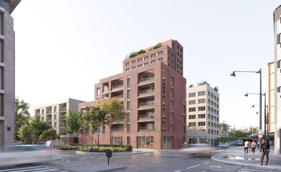 Le bâtiment à l’Ouest vient chercher une écriture plus résidentielle. Le traitement du soubassement vient en continuité du bâtiment sur le boulevard. Les étages sont marqués par un jeu de corniches, en débord de la façade. La matérialité des étages courants alterne entre avancés en enduit et fonds de loggia en parement brique rouge.
