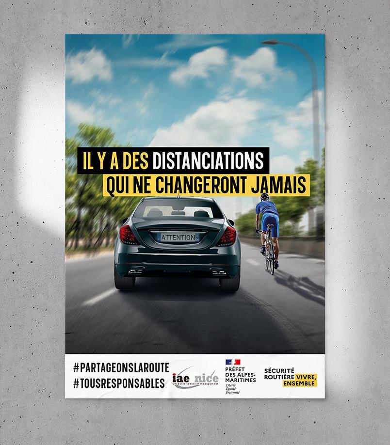 Création graphique de l’affiche gagnante du challenge « Partage de la route » lancé par la préfecture des Alpes Maritimes à la promotion 2021 2022 du M2 Marketing Digital de l’IAE de Nice. Diffusion de l’affiche au format A3 durant l’été dans les restaurants et bars de Nice.