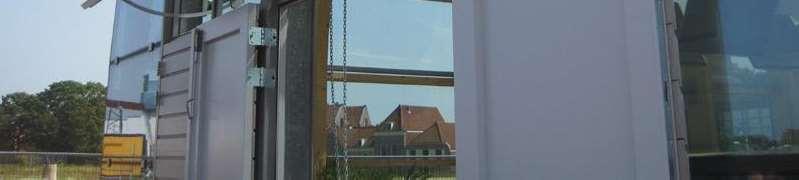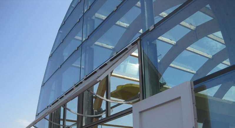 The dome is carried out in the form of a ‘low-tech’glass shell: solar controlglass isisolated using stainless steel plates firmly put on the wooden beams that, of course, refer to shipbuilding.