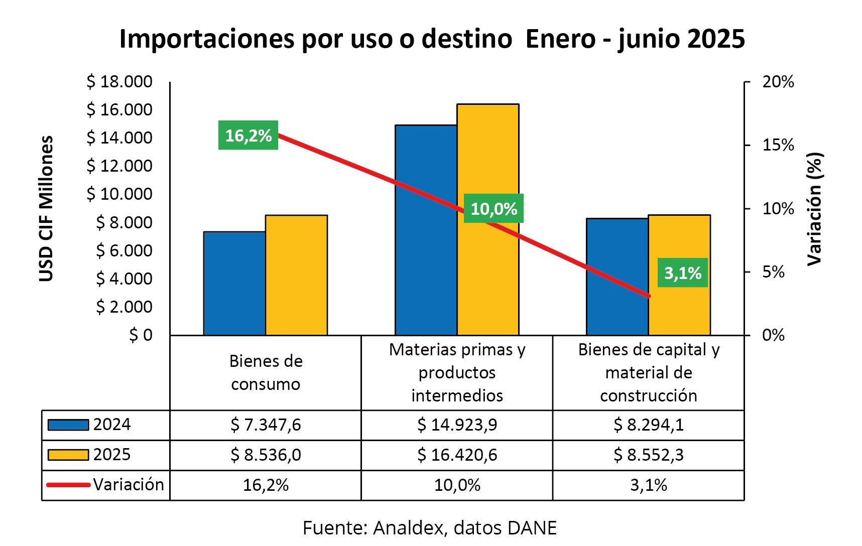 Analizando las importaciones por uso o destino económico, en el acumulado de enero - junio de 2025, las compras de materias primas y productos intermedios alcanzaron la cifra de USD CIF $16.420,6 millones, reportando un aumento de 10,0% respecto al mismo periodo del año 2024. De este grupo los productos que contribuyeron en la mayor variación positiva fueron la compra de productos químicos y farmacéuticos (11,4%), productos agropecuarios no alimenticios (18,8%) y productos mineros (8,7%).