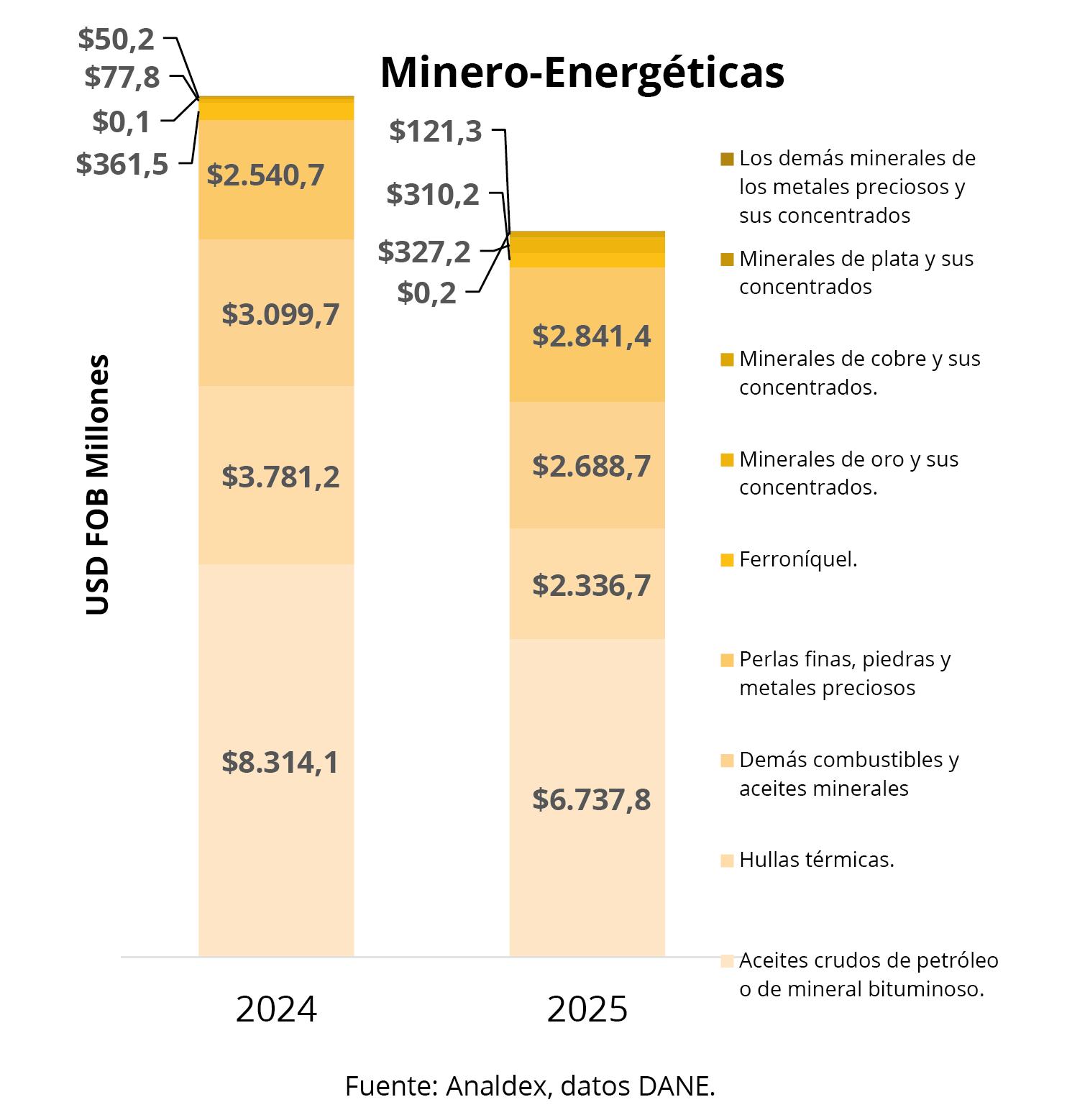 La canasta de exportación no minero-energética año corrido presentó un incremento de 21,3% contra el mismo periodo de 2024, con un total exportado de USD FOB $17.295,0 millones. Por su parte, las exportaciones minero-energéticas decrecieron 15,7%, dinámica que se explica en principal medida por la caída de las exportaciones de las Hullas térmicas (-38,2%), aceites crudos de petróleo (-19,0%) y demás combustibles y aceites minerales (-13,3%).