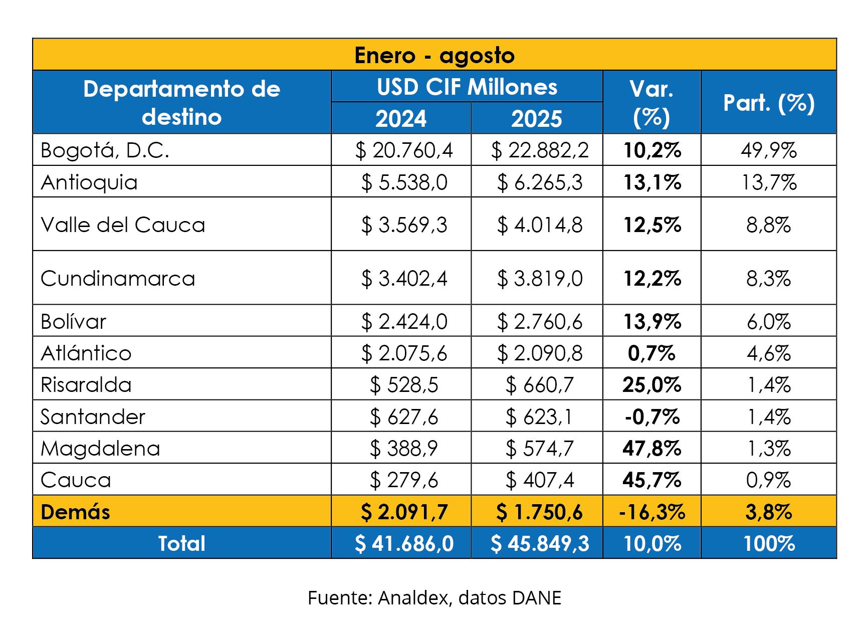 Entre enero y agosto del año 2025, la región desde la que se reportaron mayores compras externas fue Bogotá, al representar un 49,9% del total nacional, con una variación positiva de 10,2%, pasando de USD CIF $20.760,4 millones a USD CIF