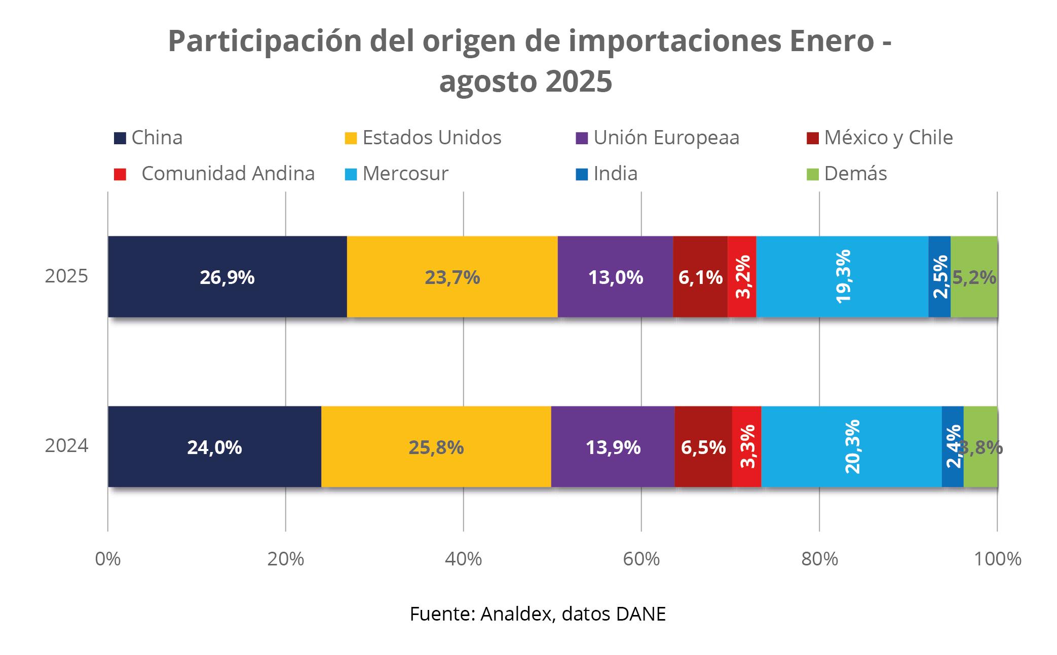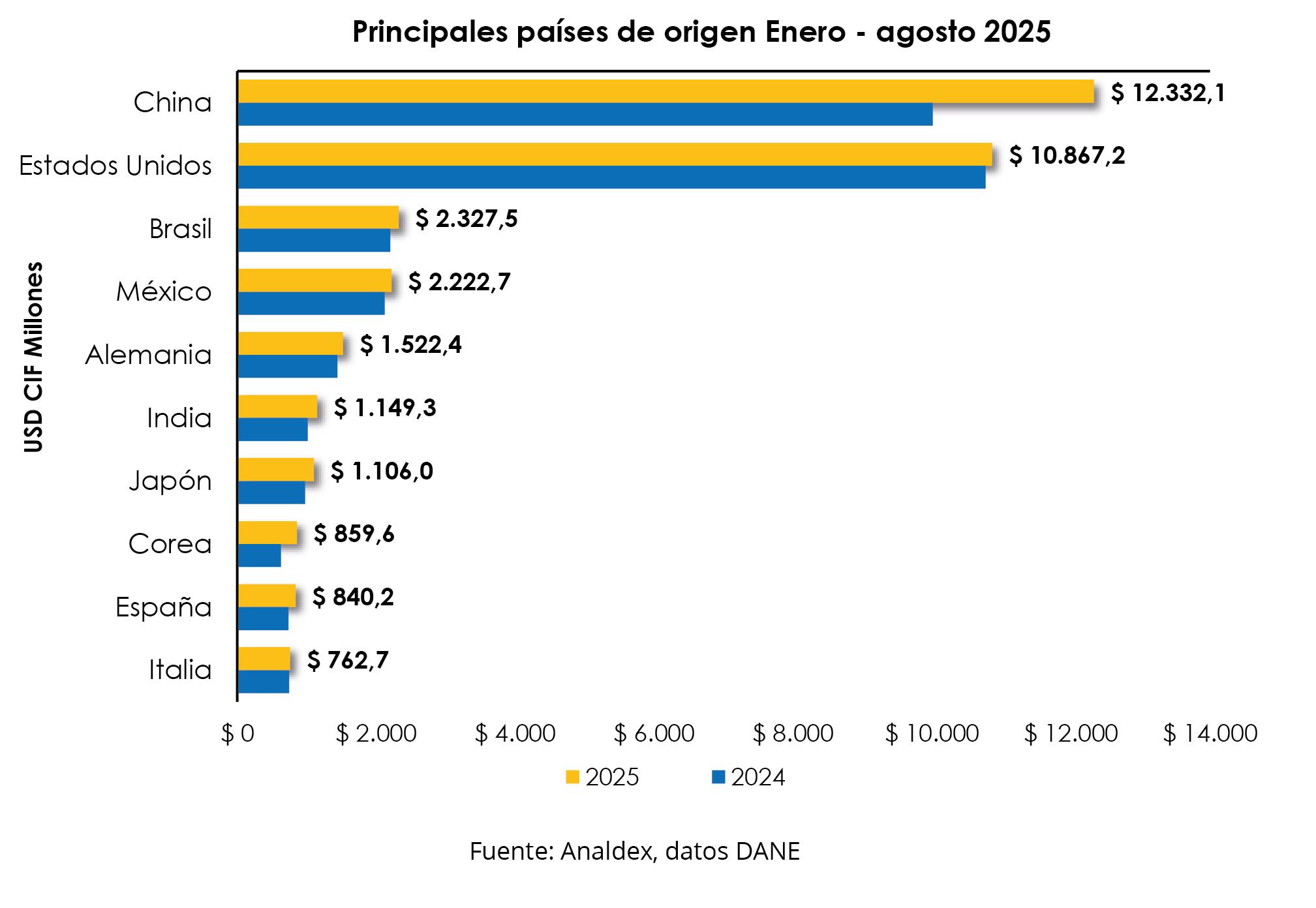 Al analizar los países de origen de los productos importados, para el acumulado del año, China sigue manteniendo el primer lugar con una participación de 26,9% confirmando superar a Estados Unidos en este año. Para este mismo periodo se registraron compras a este país por un valor de USD CIF $12.332,1 millones y una variación positiva de 23,2% respecto al periodo de referencia en el año 2024.