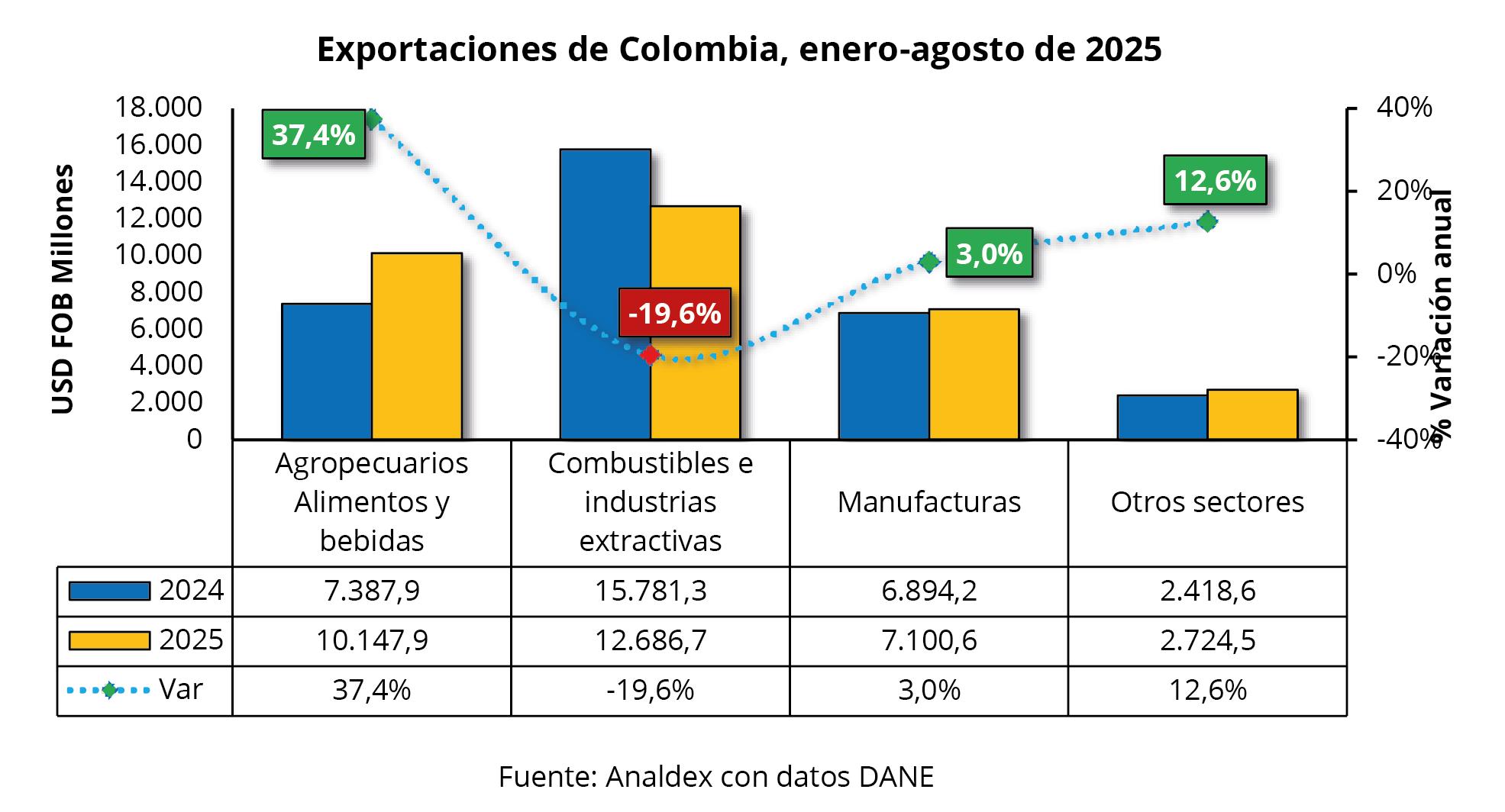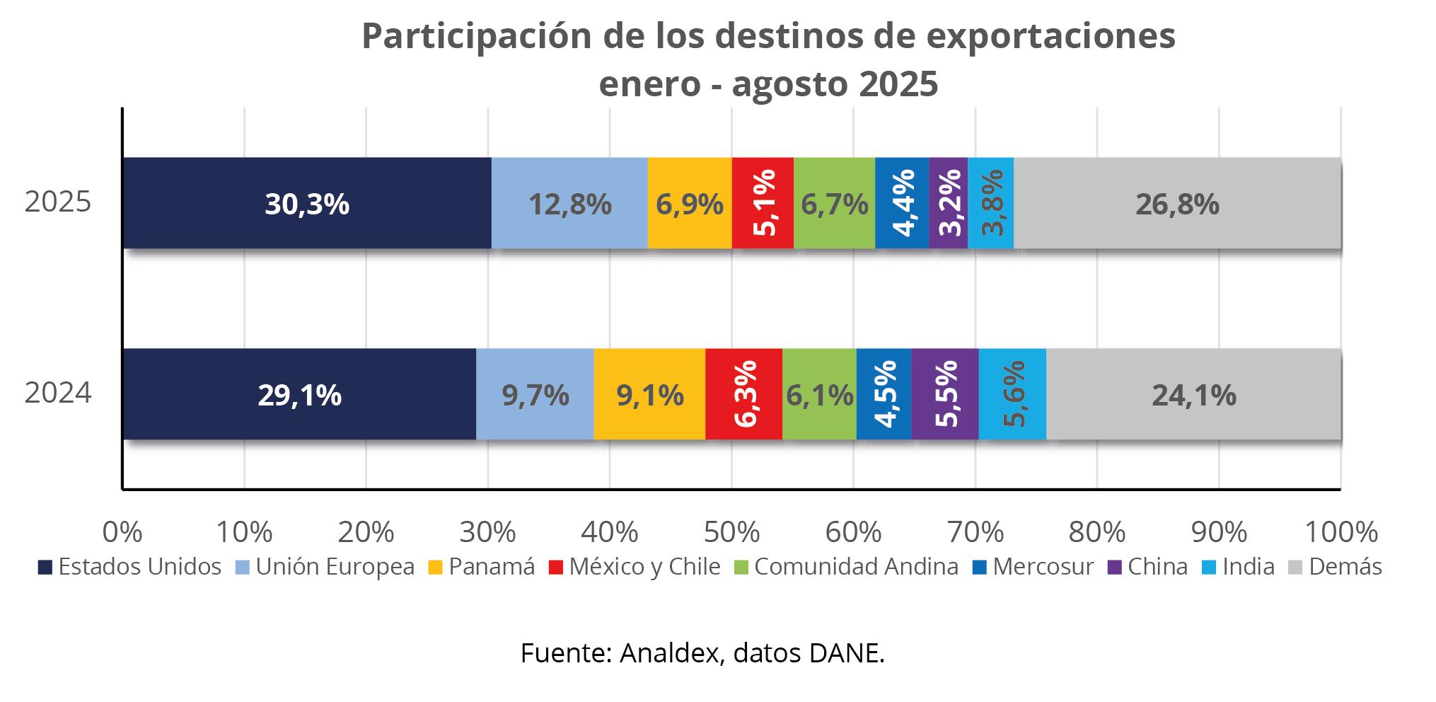 De enero a agosto del 2025, el principal destino de las ventas externas colombianas continuó siendo Estados Unidos con un crecimiento del 4,9%, al pasar de USD