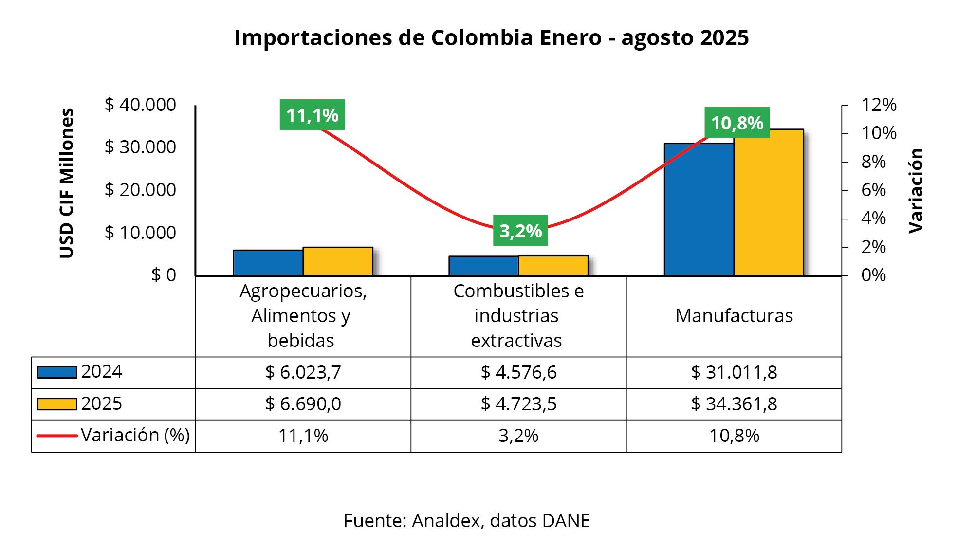 En lo acumulado de enero – agosto de 2025, las compras externas sumaron USD CIF $45.849,3 millones, presentando un incremento de 10% frente al mismo periodo de 2024 (USD CIF $41.685,9 millones). El volumen importado alcanzó 29,7 millones de toneladas, registrando un crecimiento de 10,5%.