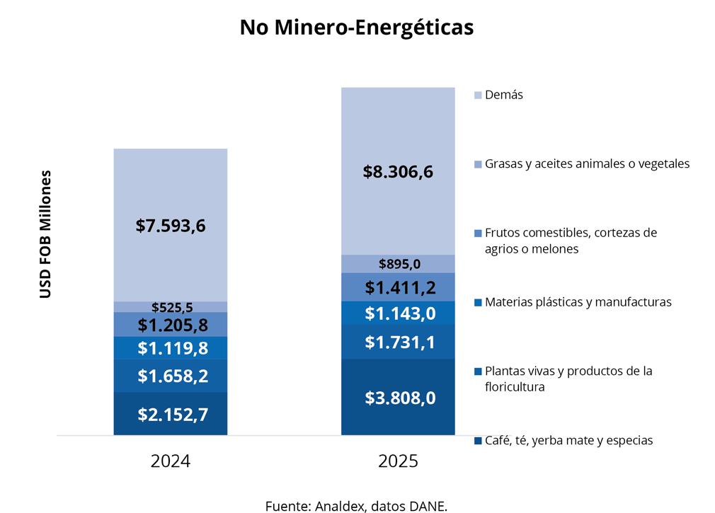 Entre los principales productos no minero-energéticos exportados en este periodo se encuentran los relacionados con los demás cafés sin tostar, sin descafeinar (USD FOB $3.671,5 millones), seguido por las demás flores y capullos frescos, cortados para ramos o adornos (USD FOB $841,4 millones) y Bananas o plátanos tipo “cavendish valery” frescos con USD FOB $834,2 millones.
