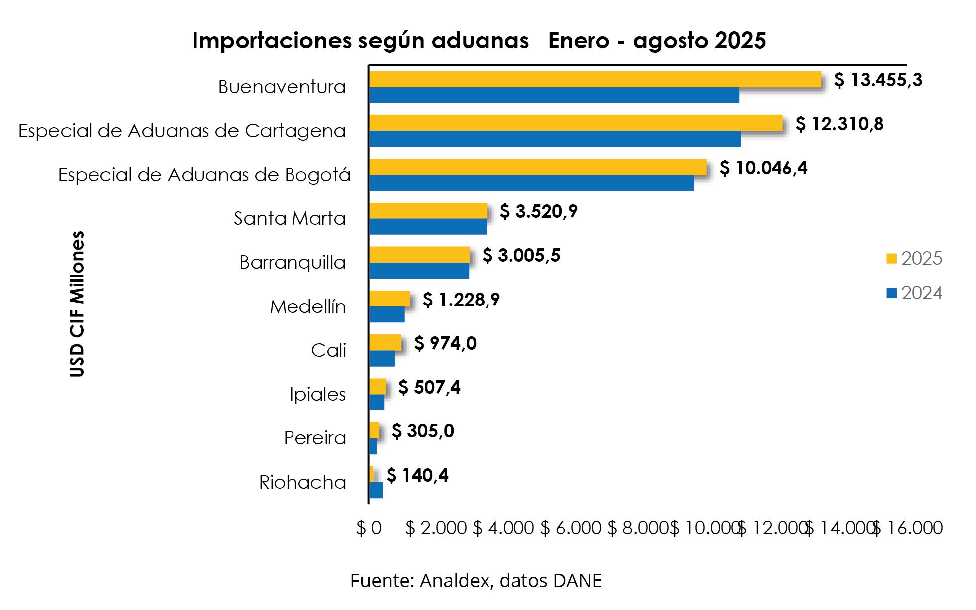 En lo corrido del año, Buenaventura fue la principal aduana de ingreso de las importaciones, al representar el 29,3% del total. Se evidenció un crecimiento de las compras al exterior por esta aduana de 22,2%, al pasar de USD CIF $11.014,9 millones a USD CIF $13.455,3 millones.