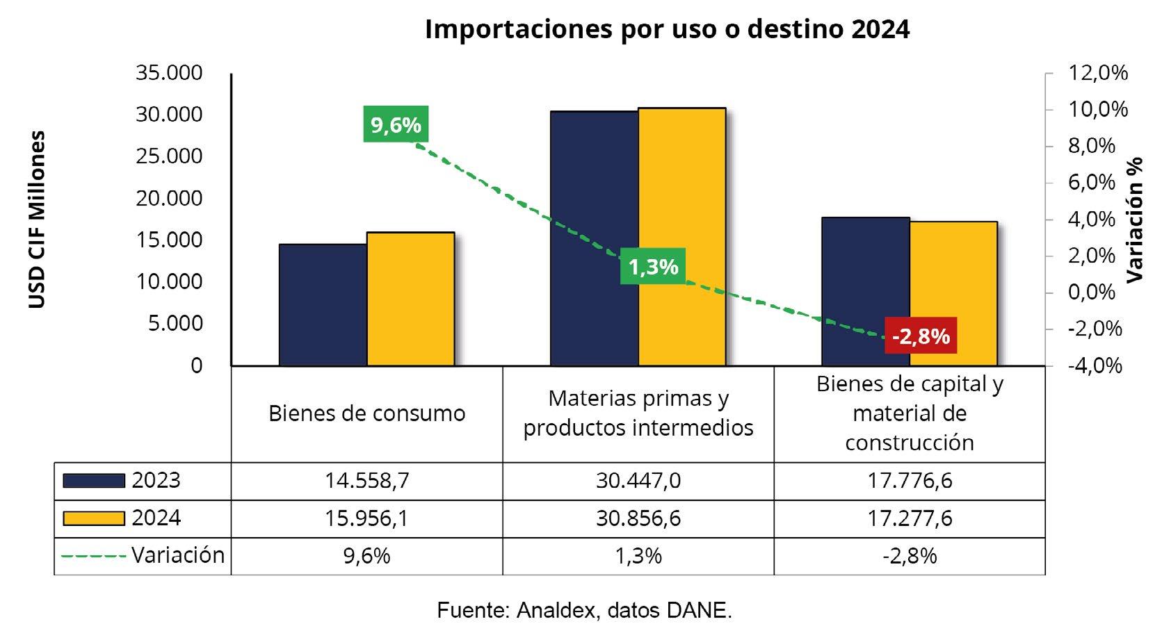 Analizando las importaciones por uso o destino económico en 2024, las compras de materias primas y productos intermedios alcanzaron la cifra de USD CIF $30.856,6 millones, reportando un aumento de 1,3% respecto al año 2023. De este grupo los productos que contribuyeron en la mayor variación positiva fueron los productos químicos y farmacéuticos (9,1%) y productos agropecuarios no alimenticios (17,1%).