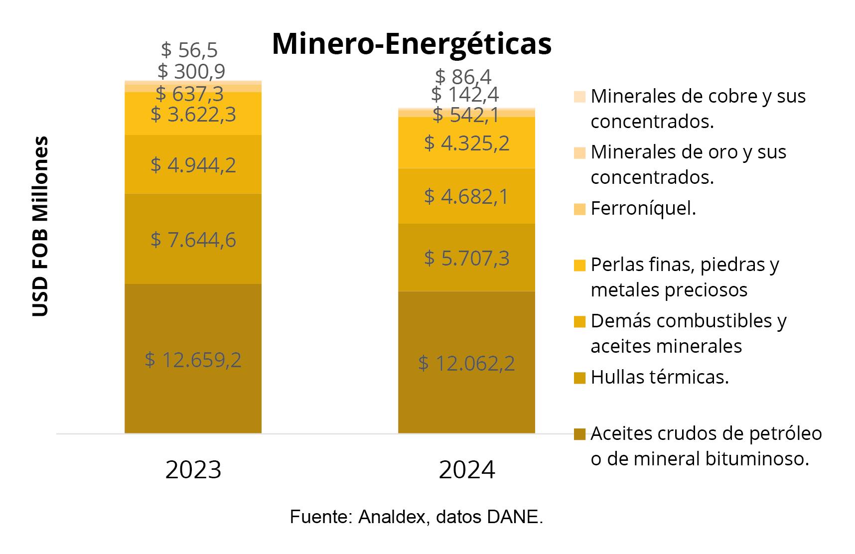 Para el año 2024, el saldo comercial de mercancías es deficitario, alcanzando para este periodo la cifra de USD FOB -$10.811,3 millones, mientras que para el año 2023 fue de USD FOB -$9.676,2 millones. Por tanto, se evidencia un aumento del déficit comercial de Colombia en un 11,7%.
