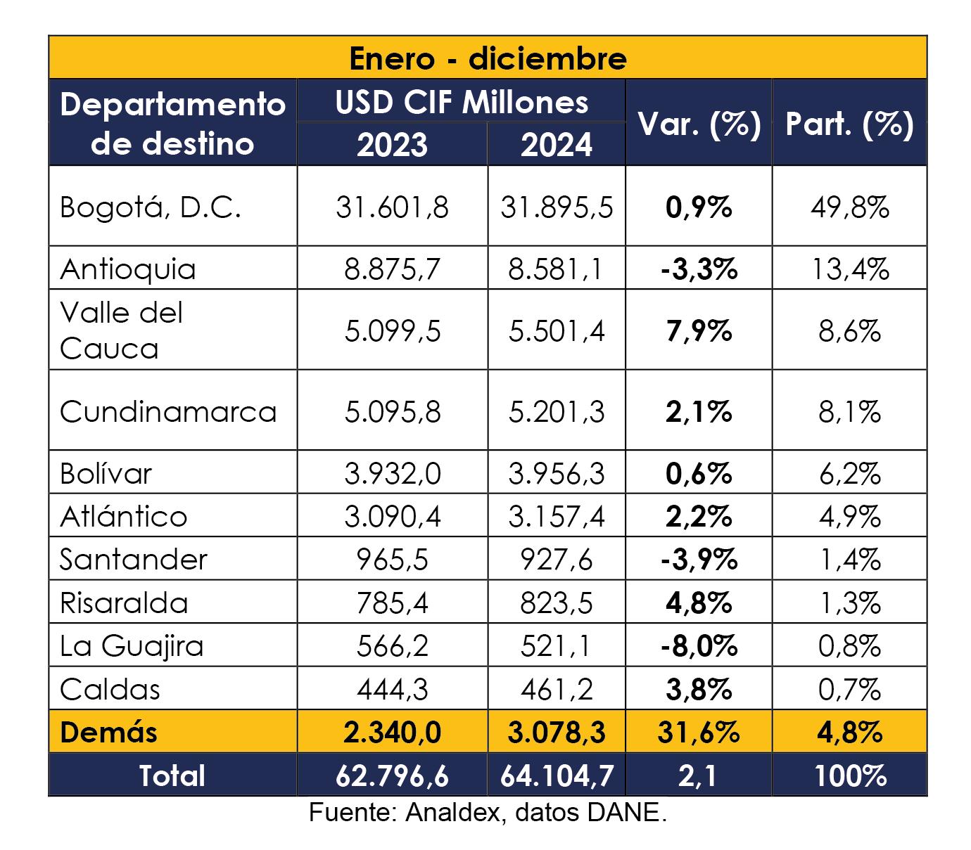un valor de USD CIF $15.936 millones, logrando una participación de 24,9% en las importaciones colombianas.