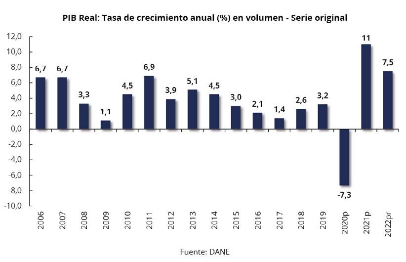 Con este resultado y con las correcciones que tuvieron los tres trimestres anteriores, el crecimiento del PIB cierra el año 2022 por debajo de lo esperado por el mercado, con una variación anual de 7,5% jalonado principalmente por el gasto de consumo final. Así, la economía colombiana ingresa en una tendencia de retorno al crecimiento económico de los niveles previos a la pandemia.