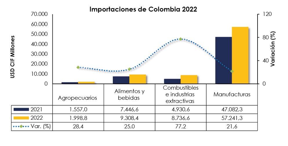 Las importaciones de manufacturas del año 2022 alcanzaron el valor de USD CIF 57.241,3 millones, con un crecimiento de 21,6%. La variación del grupo se explicó principalmente por el crecimiento en las compras externas de vehículos de carretera (31,7%) seguido de otro equipo de transporte (84,5%), y maquinaria y equipo generadores de fuerza (71,1%). Por el contrario, productos medicinales y farmacéuticos contribuyeron negativamente a la variación cayendo un 9,2%.