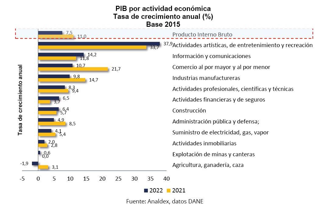 Desde el enfoque de la producción, en 2022 se evidenció un crecimiento de todas las actividades productivas frente al mismo periodo del 2021, excepto en el grupo de agricultura, el cual decreció -1,9% frente al nivel del 2021. En este periodo, los grupos que más crecieron fueron: actividades artísticas y de entretenimiento con 40,5%, seguido por las actividades financieras y de seguros con 8,4% e información y comunicaciones con 5,7%.