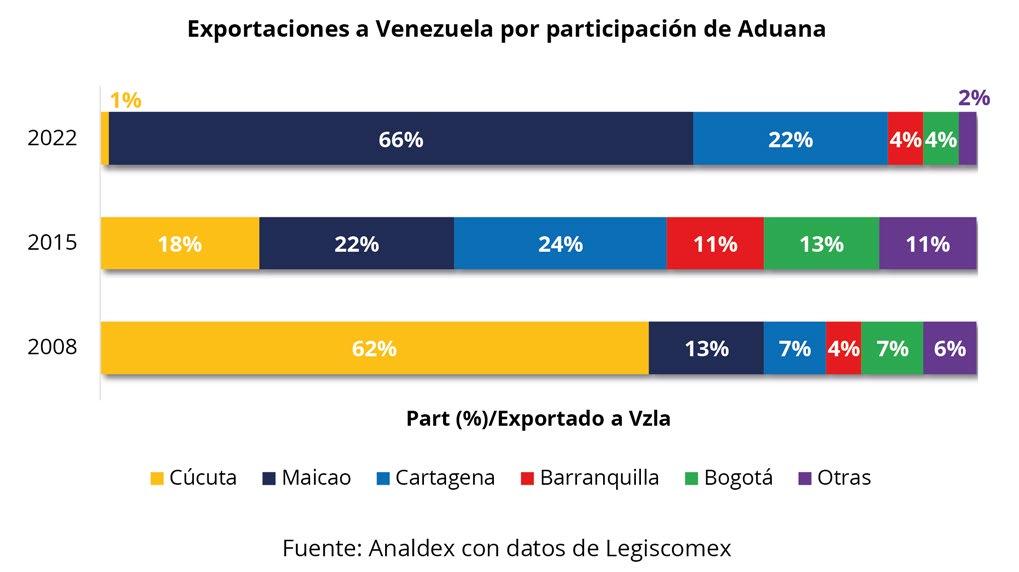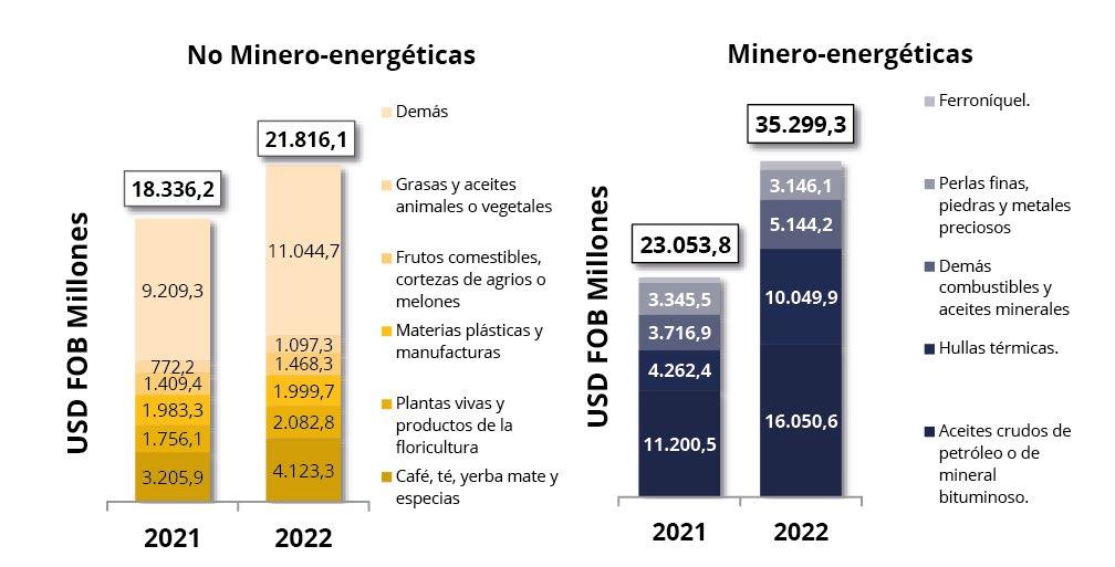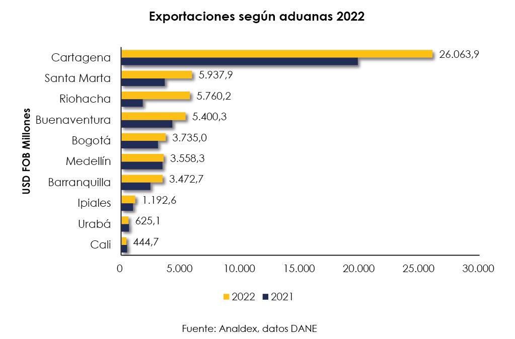 Durante el 2022, la principal aduana para salida de exportaciones continuó siendo Cartagena representando el 45,6% de participación. Esta aduana presentó un crecimiento de 31,6%, al pasar de USD FOB 19.805 millones en 2021 a USD FOB 26.063,9 millones para 2022. En segundo lugar, se ubica la aduana Santa Marta. Esta participó en 10,4% con un crecimiento de 62,7% pasando en 2021 de USD FOB 3.650,2 millones a USD FOB 5.937,9 millones en 2022. En tercer lugar, se ubica Riohacha con una participación de 10,1% en el total de salidas nacionales y presentando un crecimiento de 218,3%, al pasar de USD FOB 1.809,8 millones en 2021 a USD FOB 5.760,2 millones para 2022.