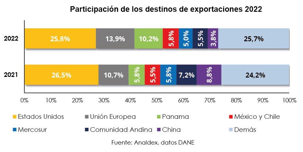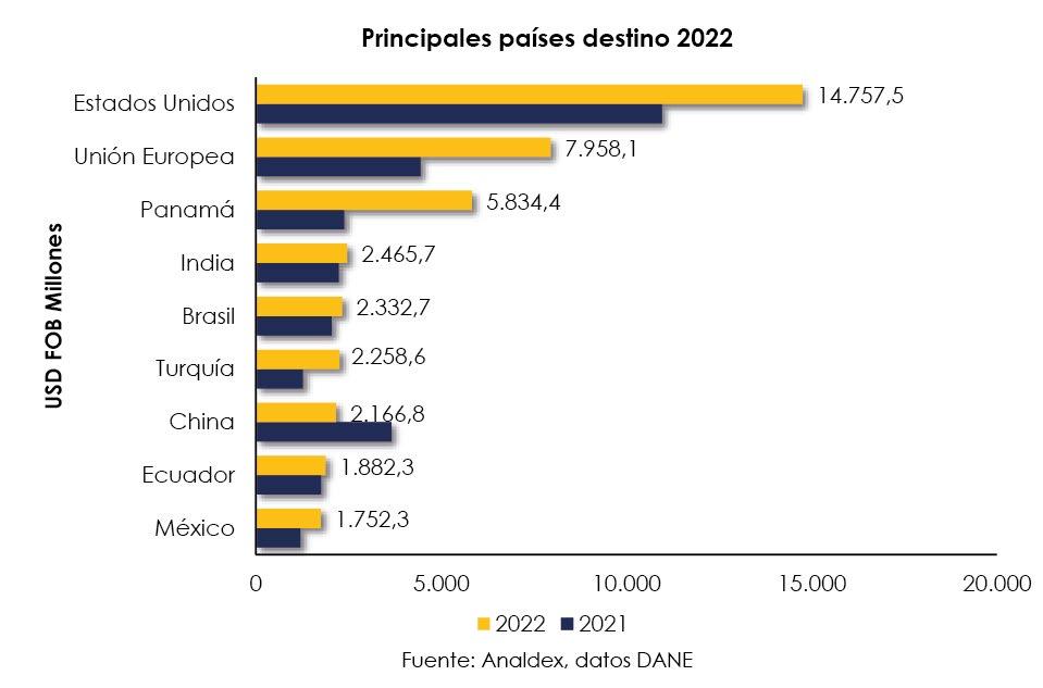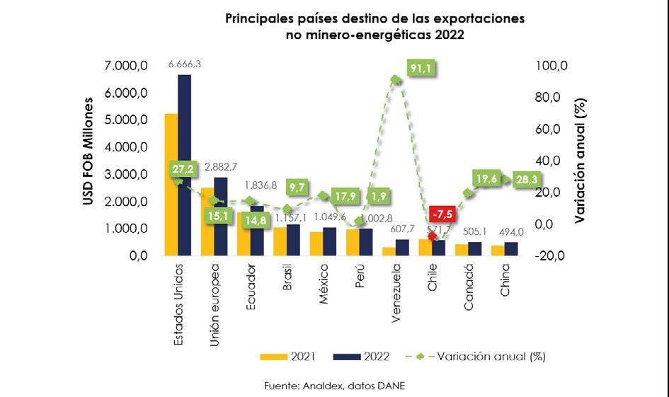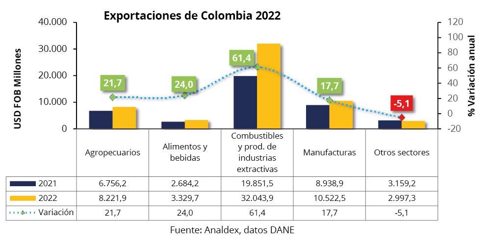 Colombia exportó en 2022 más de USD 57.000 millones, lo cual generó un crecimiento de 38% respecto al mismo periodo de 2021. Las exportaciones no minero-energéticas representaron el 41% del total de las ventas externas del país y dos de nuestros afiliados tuvieron una participación significativa en esta cifra.