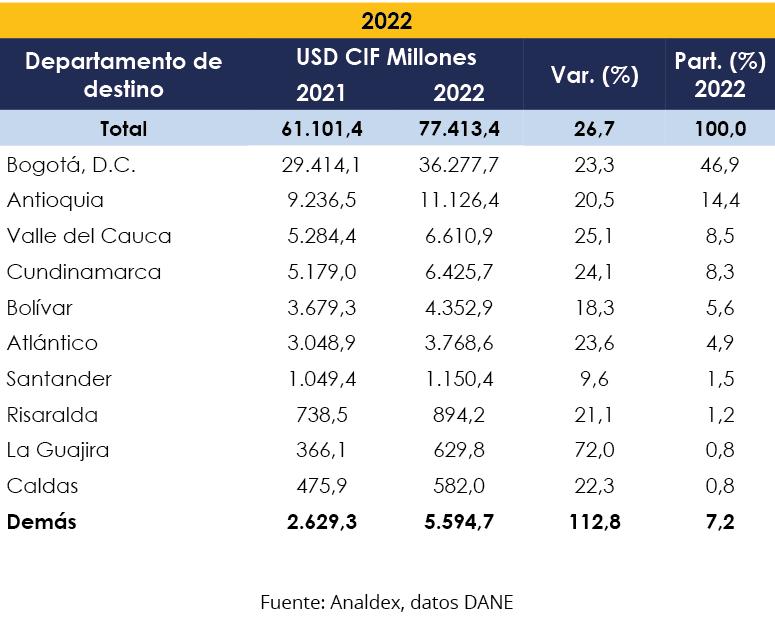En lo acumulado del año 2022, el destino que realizó mayores compras externas fue Bogotá, al representar un 46,9% del total nacional, con una variación de 23,3%, pasando de USD CIF 29.414,1 millones en 2021 a USD CIF 36.277,7 millones en 2022. En segundo lugar, se encuentra Antioquia con una participación de 14,4%.