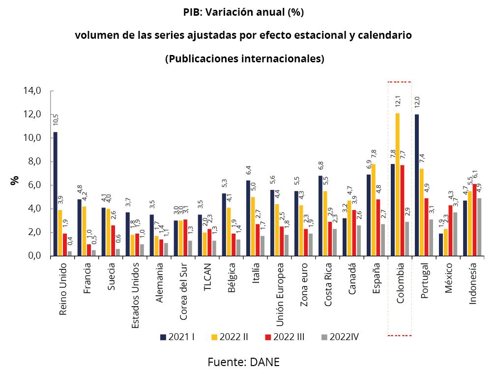 Según el DANE, al comparar con los países de la OCDE que ya han publicado este dato, se destaca a Colombia como la cuarta economía con mayor crecimiento del Producto Interno Producto en el cuarto trimestre del año, solo por debajo de Indonesia, México y Portugal.