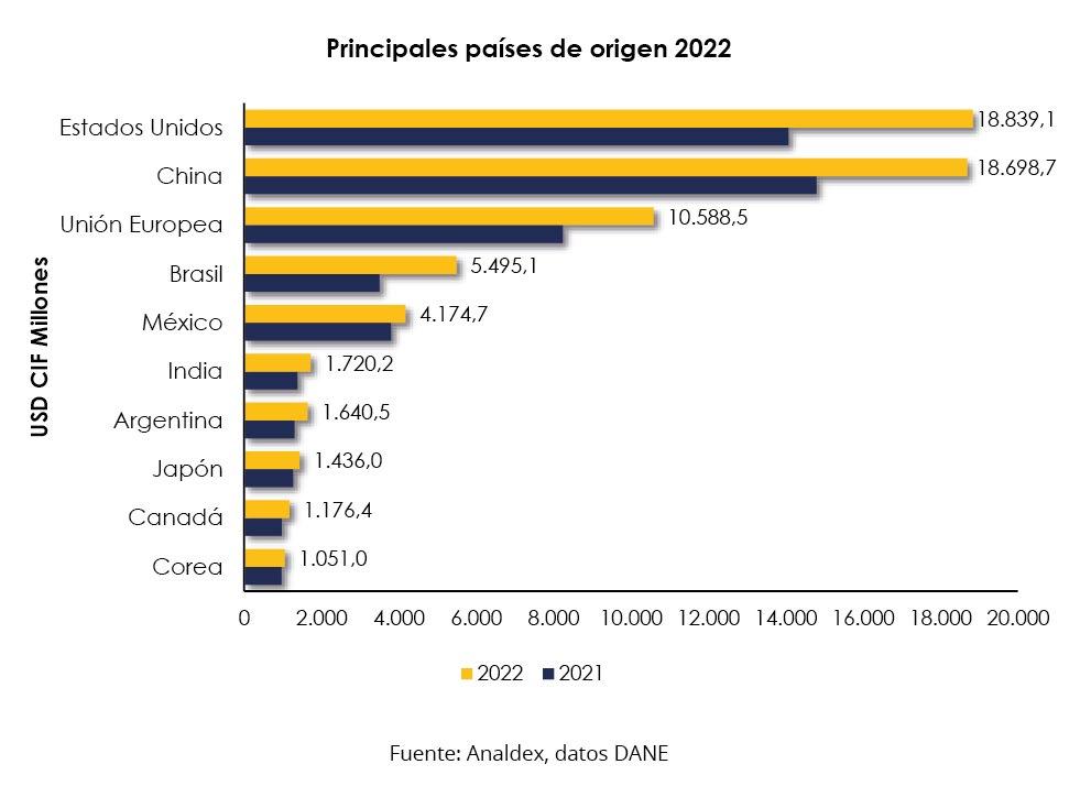 Al analizar los países de origen de los productos importados, para el año 2022, Estados Unidos se ubica en primer lugar con una participación de 24,3%. Para este mismo año se registraron compras a este país por valor de USD CIF 18.839,1 millones y una variación de 33,9% respecto al 2021. Principalmente fueron importados productos como gasolina para motores y otros aceites ligeros.