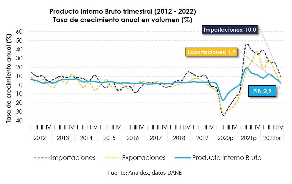 Según el DANE, el crecimiento de la economía colombiana cerró el cuarto trimestre de 2022 con una variación de 2,9%, con respecto al mismo trimestre de 2021, cifra que se sitúa por debajo del rango de las expectativas de los analistas que lo ubicaban entre un 3,4% y 4,5%.