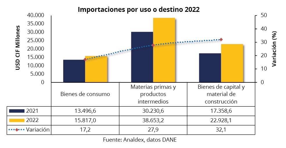 no económico, en el año 2022 las compras de materias primas y productos intermedios alcanzaron la cifra de USD CIF 38.653,2 millones, reportando un crecimiento de 27,9% respecto al año 2021. De este grupo se registró una mayor contribución a la variación en materias primas y productos intermedios para la industria cuyo crecimiento fue de 16,9%, al mismo tiempo que Combustibles, lubricantes y conexos, el cual presentó un incremento de 95,4%.