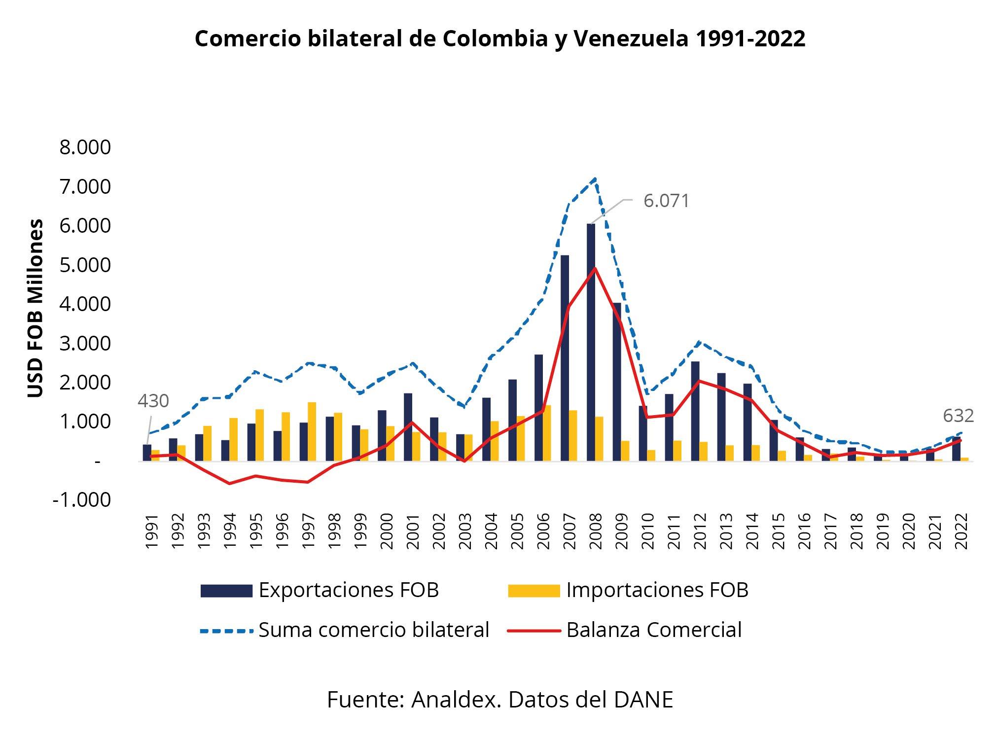 En el año 2022, se registró un déficit en la balanza comercial colombiana de USD FOB 14.331,0 millones. En el año 2021 se presentó un déficit de USD FOB 15.258,8 millones, lo cual representa una disminución de este saldo negativo en un 6,1%, con respecto al mismo período del 2021.