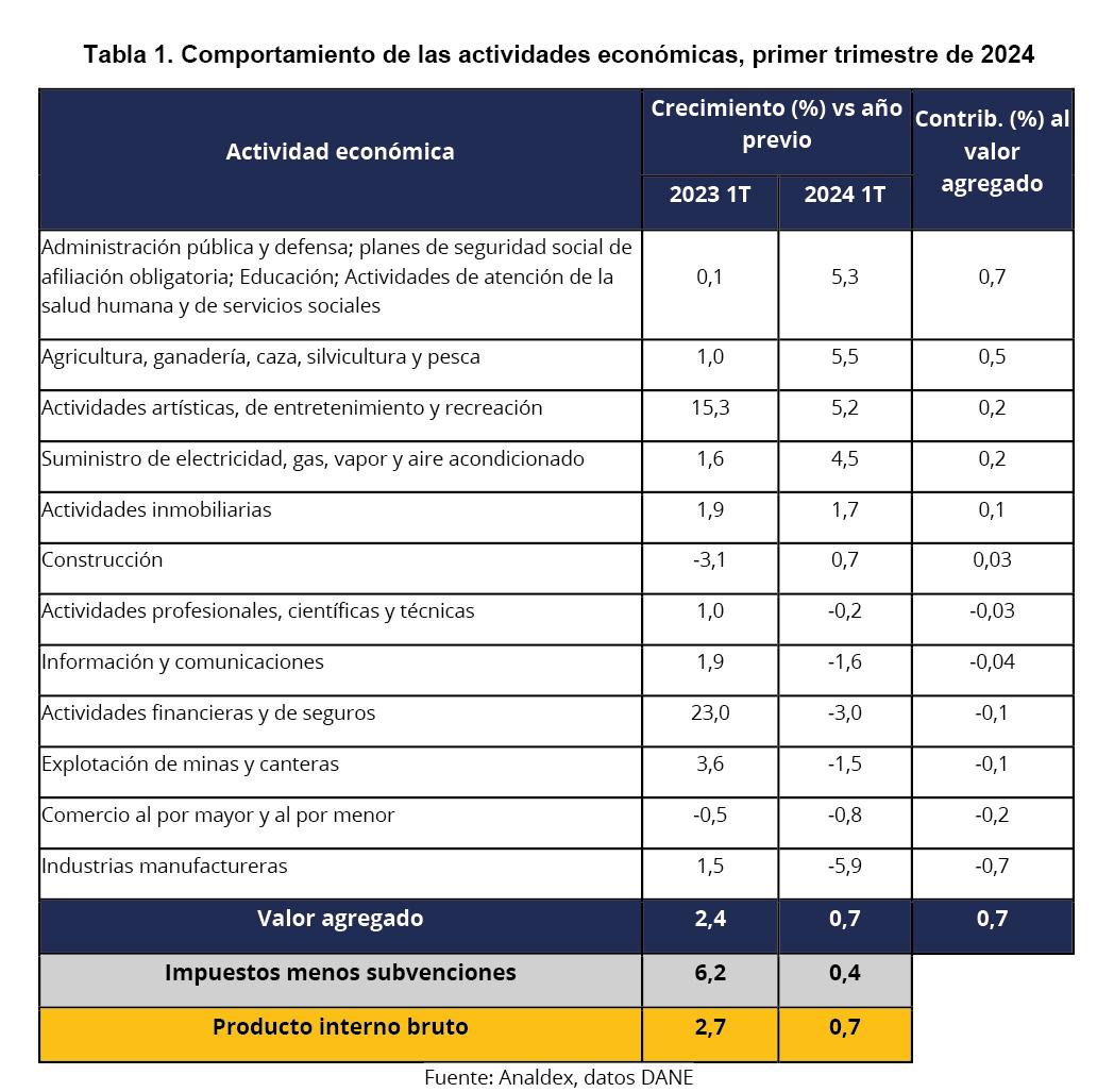 mía colombiana de 0,7%, con respecto al mismo periodo de 2023. Con ello, se confirma la persistente desaceleración de la economía colombiana que al cierre del año proyecta, según analistas y organismos internacionales, un crecimiento entre 0,9% y 1,5% en 2024.
