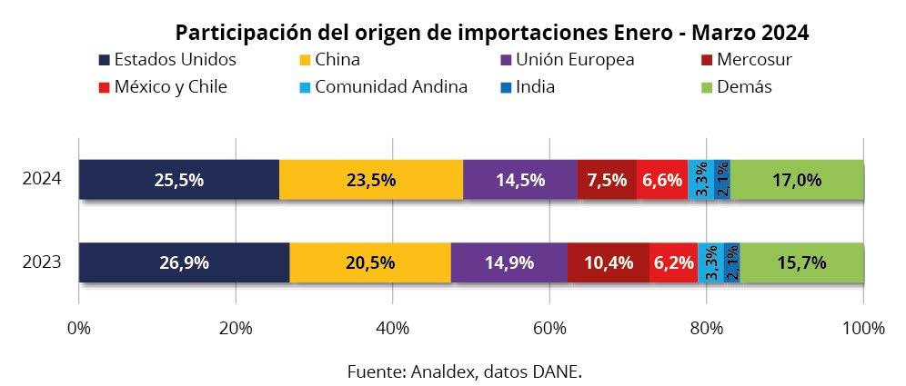 Observando el comportamiento en la participación de origen de las importaciones, se evidencia principalmente un decrecimiento de 1,4 puntos porcentuales en la participación de las importaciones desde Estados Unidos y para China se registra una aumento sustancial de 3 puntos porcentuales. Mientras que hay un decremento de 2,9 puntos porcentuales de la Mercosur.