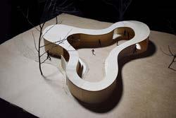 Below, the diagram expresses how the Museum of the Baroque is born from a grid that shifts and defines intersection points to establish the circulation through the buidling, which encourages moving along the curved concrete walls to move around the spaces.