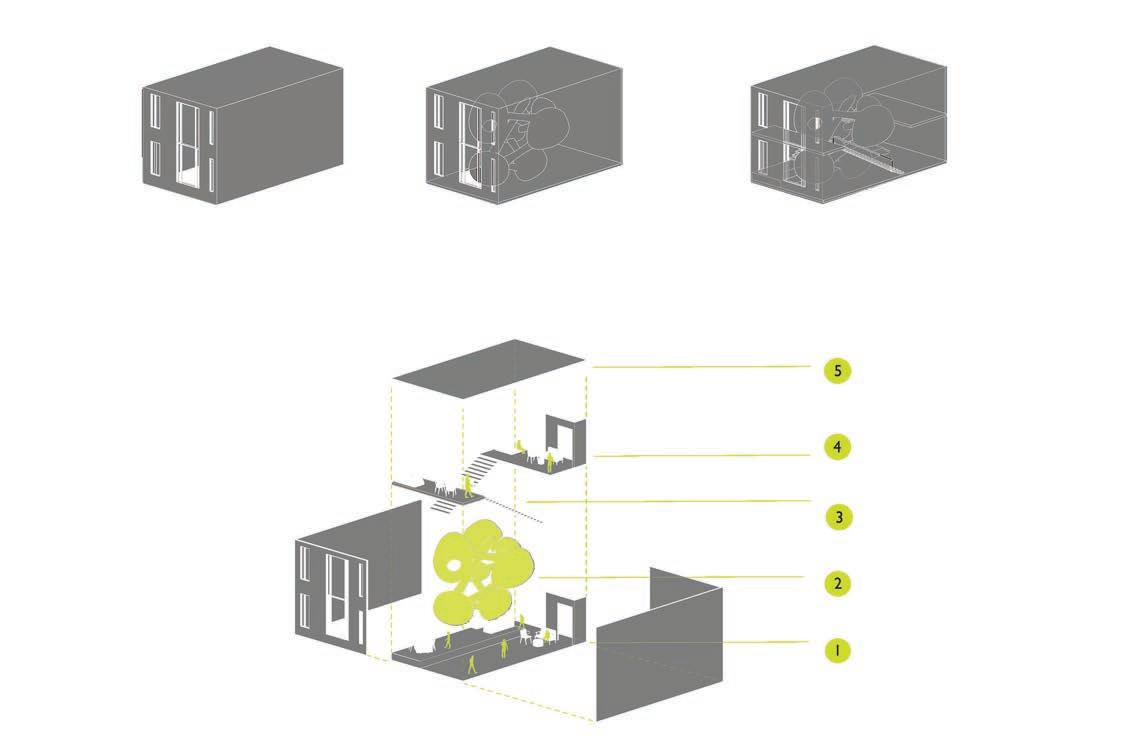 The conceptual drawing explores the idea of instant architecture. By defining certain elements considered crucial for the success of any given project, it is possible to conceive them as guiding principles that may “float” and “land” in a project to give it life.