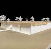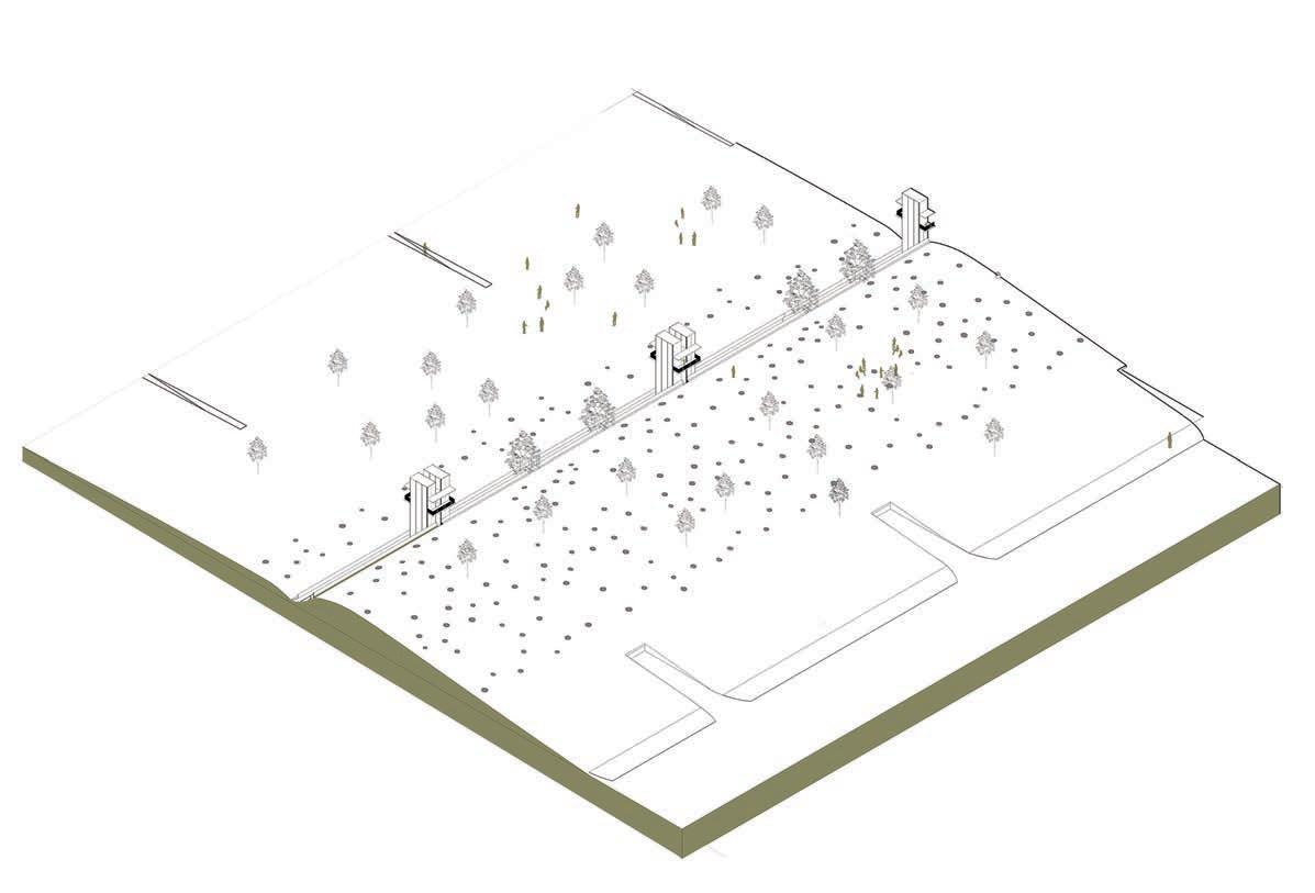 In the project, the architecture moves underground to make room for parks and green areas on the surface. Parking will also be concealed from the public, as cars will enter through the green dune facing the street. Underground spaces will be naturally illuminated through skylights that peek out of the ground, providing for elements that populate the site on the surface. These skylights turn into tapered columns at times as they break through the ground, emulating the trees above.