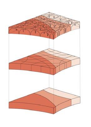 On the left, the diagram shows the different layers behind the pattern of the arches that populate the space in order to develop a sequence and a series of rooms. While having three major zones, the space is further broken down .