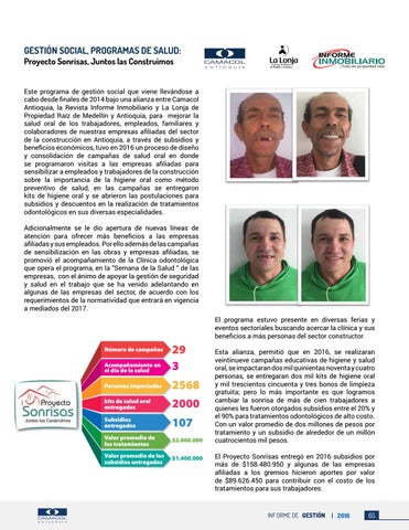 Este programa de gestión social que viene llevándose a cabo desde finales de 2014 bajo una alianza entre Camacol Antioquia, la Revista Informe Inmobiliario y La Lonja de Propiedad Raíz de Medellín y Antioquia, para mejorar la salud oral de los trabajadores, empleados, familiares y colaboradores de nuestras empresas afiliadas del sector de la construcción en Antioquia, a través de subsidios y beneficios económicos, tuvo en 2016 un proceso de diseño y consolidación de campañas de salud oral en donde se programaron visitas a las empresas afiliadas para sensibilizar a empleados y trabajadores de la construcción sobre la importancia de la higiene oral como método preventivo de salud, en las campañas se entregaron kits de higiene oral y se abrieron las postulaciones para subsidios y descuentos en la realización de tratamientos odontológicos en sus diversas especialidades. Adicionalmente se le dio apertura de nuevas líneas de atención para ofrecer más beneficios a las empresas afiliadas y sus empleados. Por ello además de las campañas de sensibilización en las obras y empresas afiliadas, se promovió el acompañamiento de la Clínica odontológica que opera el programa, en la “Semana de la Salud “ de las empresas, con el ánimo de apoyar la gestión de seguridad y salud en el trabajo que se ha venido adelantando en algunas de las empresas del sector, de acuerdo con los requerimientos de la normatividad que entrará en vigencia a mediados del 2017. El programa estuvo presente en diversas ferias y eventos sectoriales buscando acercar la clínica y sus beneficios a más personas del sector constructor.