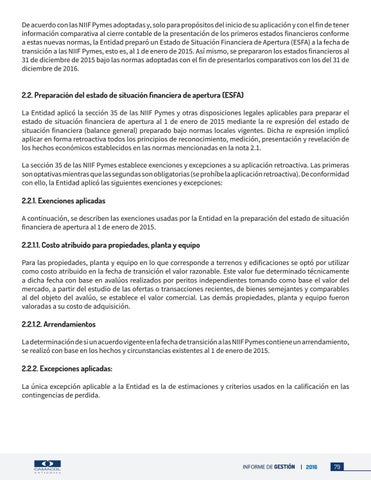 2.2. Preparación del estado de situación financiera de apertura (ESFA) La Entidad aplicó la sección 35 de las NIIF Pymes y otras disposiciones legales aplicables para preparar el estado de situación financiera de apertura al 1 de enero de 2015 mediante la re expresión del estado de situación financiera (balance general) preparado bajo normas locales vigentes. Dicha re expresión implicó aplicar en forma retroactiva todos los principios de reconocimiento, medición, presentación y revelación de los hechos económicos establecidos en las normas mencionadas en la nota 2.1. La sección 35 de las NIIF Pymes establece exenciones y excepciones a su aplicación retroactiva. Las primeras son optativas mientras que las segundas son obligatorias (se prohíbe la aplicación retroactiva). De conformidad con ello, la Entidad aplicó las siguientes exenciones y excepciones: