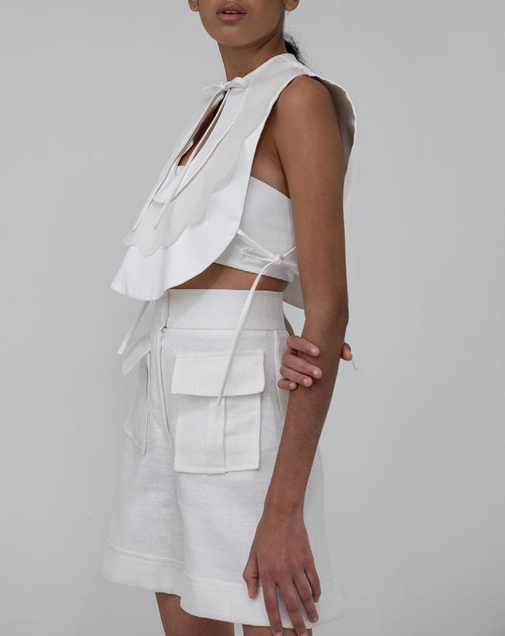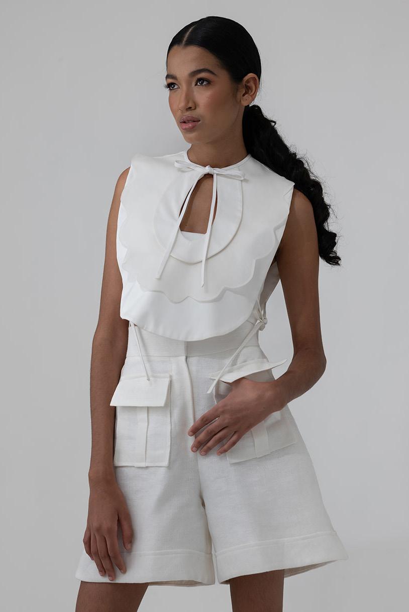 es un croptop sin mangas de escote V, con doble pechera circular y abotonadura delantera.