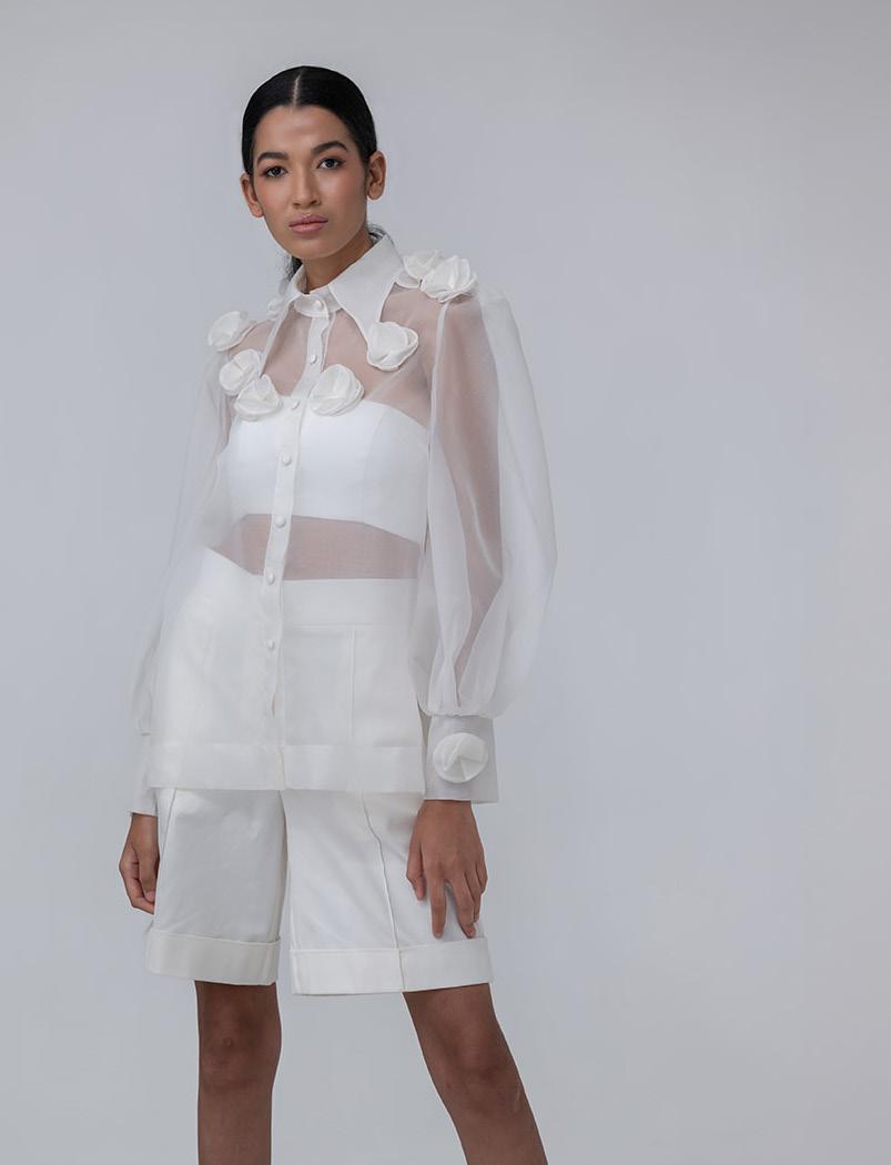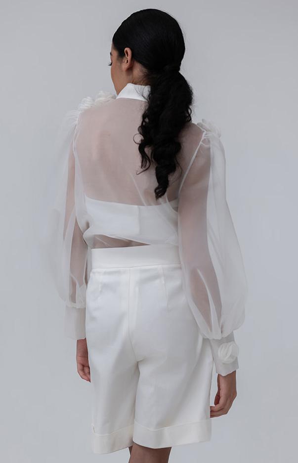 es una camisa clásica de mangas abuchadas en organza, abotonadura delantera, cuello picudo y flores hechas a mano en la pechera y los puños.