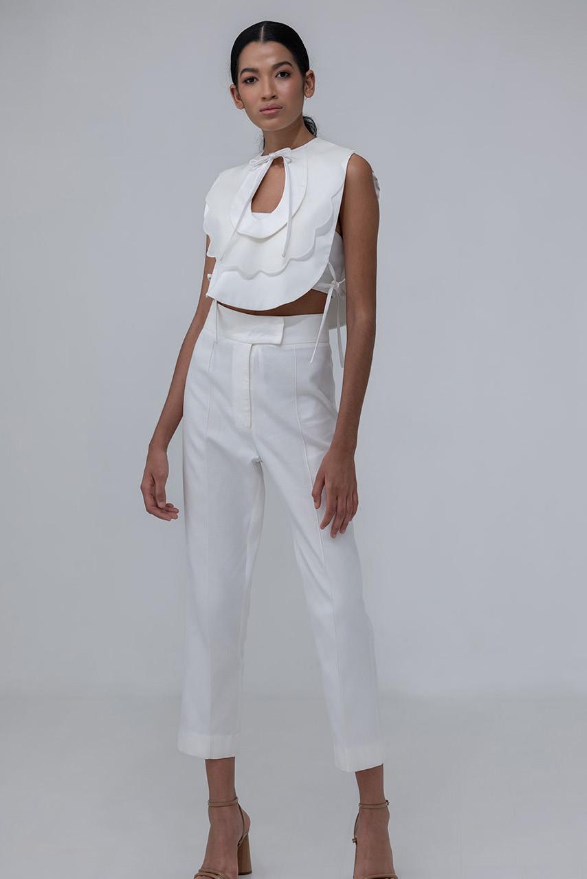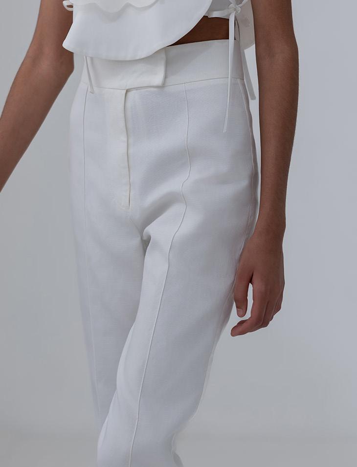 es un pantalón recto al tobillo en algodón pique con cierre delantero.